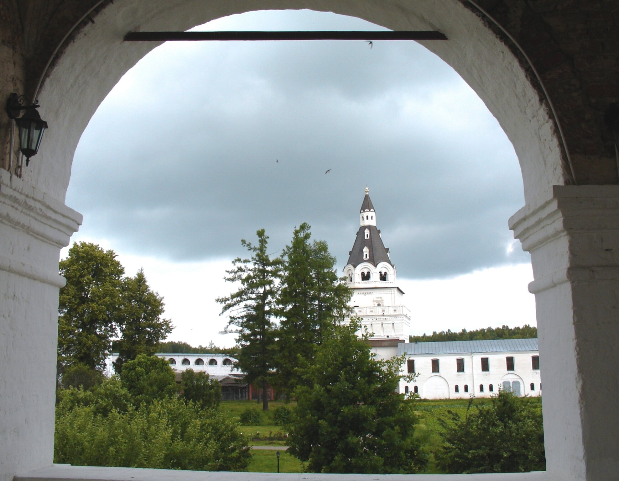 Сквозь арку также просматриваются другие строения святой обители, основанной преподобным Иосифом Волоцким в 1479 году. Монастырь, расположенный в окрестностях древнего Волока Ламского, на протяжении веков был не только важным духовным центром, но и мощной крепостью, охранявшей подступы к Москве. Его архитектурный ансамбль, формировавшийся на протяжении XVI–XIX веков, ныне является объектом культурного наследия народов России.