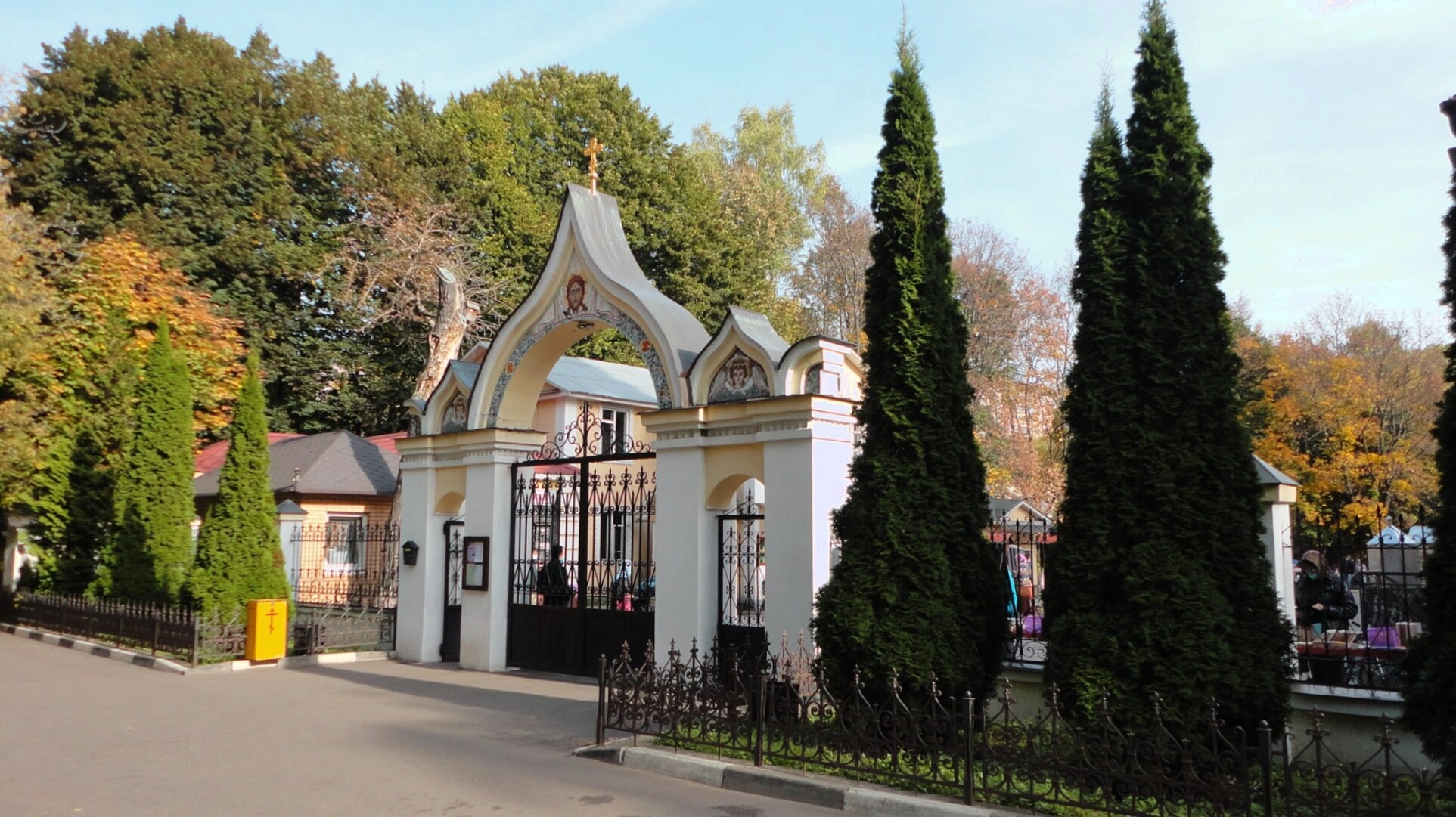 Территория обители благоустроена и огорожена белым забором с металлическими решетками. По периметру высажены высокие туи и другие деревья, создающие благоговейную атмосферу уединенности. Пышная растительность, включая хвойные и лиственные породы, некоторые из которых приобрели осенние желтые оттенки, обрамляет святые врата с обеих сторон.