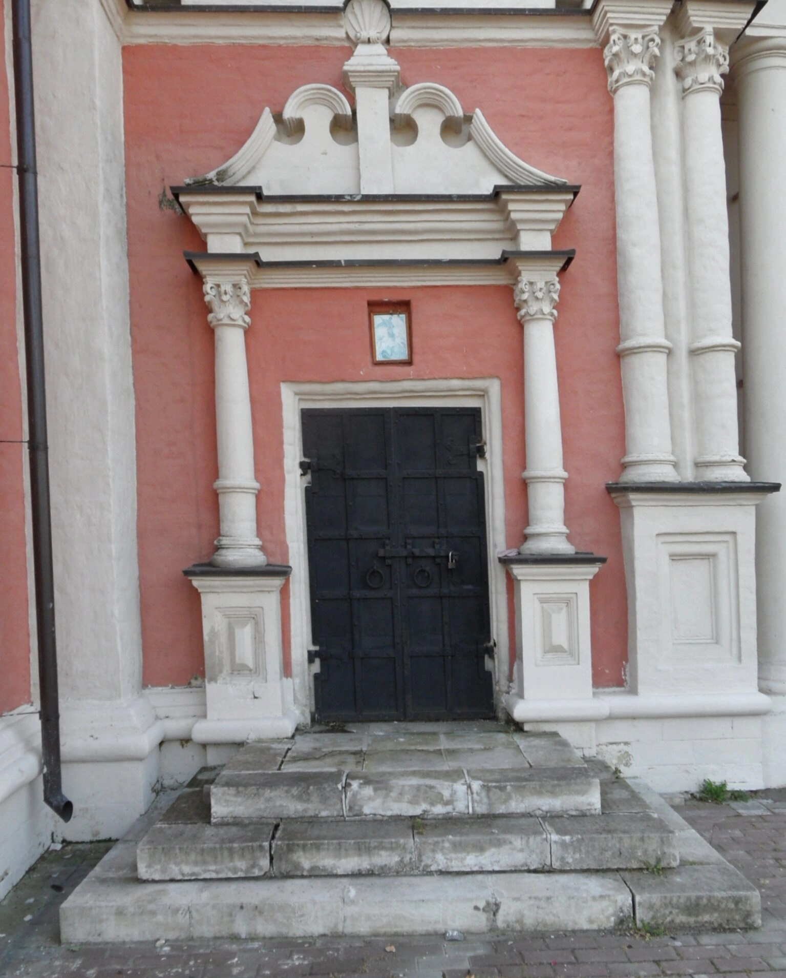 Центральным элементом композиции выступают массивные двустворчатые двери темного цвета, выполненные из металла. Дверной проем оснащен крупными декоративными петлями и двумя замками-засовами, что подчеркивает основательность и надежность конструкции. Вход в дом Божий обрамлен изящным белым порталом, выполненным в традициях барокко, который поддерживают две колонны с коринфскими капителями, символизирующими духовное величие и благодать.