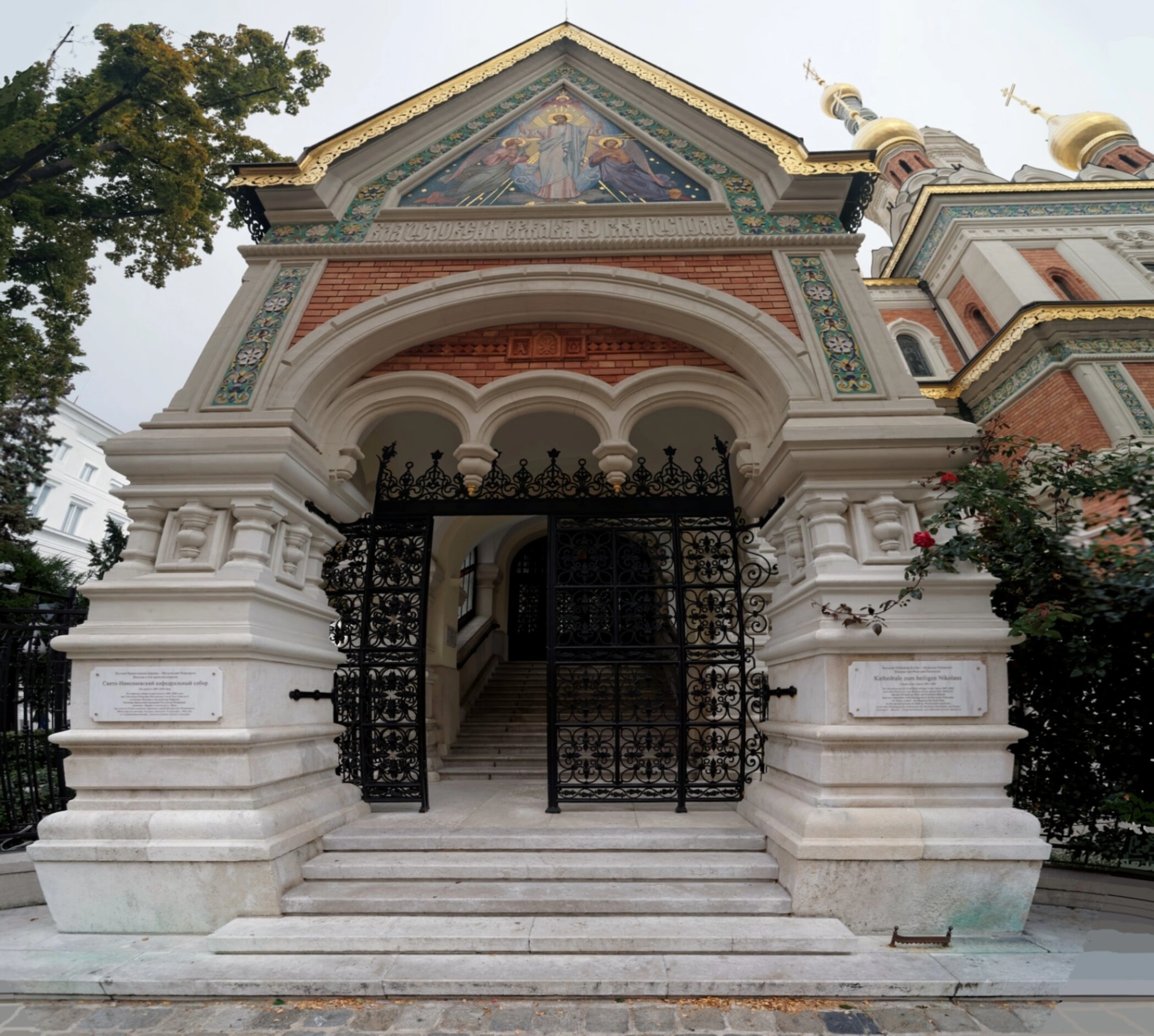 Храмовая территория благоустроена и ухожена, по бокам от паперти растут декоративные кусты с алыми розами, добавляющими яркий акцент в строгое, но благолепное убранство. Вся архитектоника входа направляет взор и душу молящегося вверх, к небесам, готовя к предстоящему молитвенному предстоянию в освящённом пространстве храма. Этот собор является не только духовным центром, но и важным символом русского присутствия и культурного наследия в самом сердце Европы.
