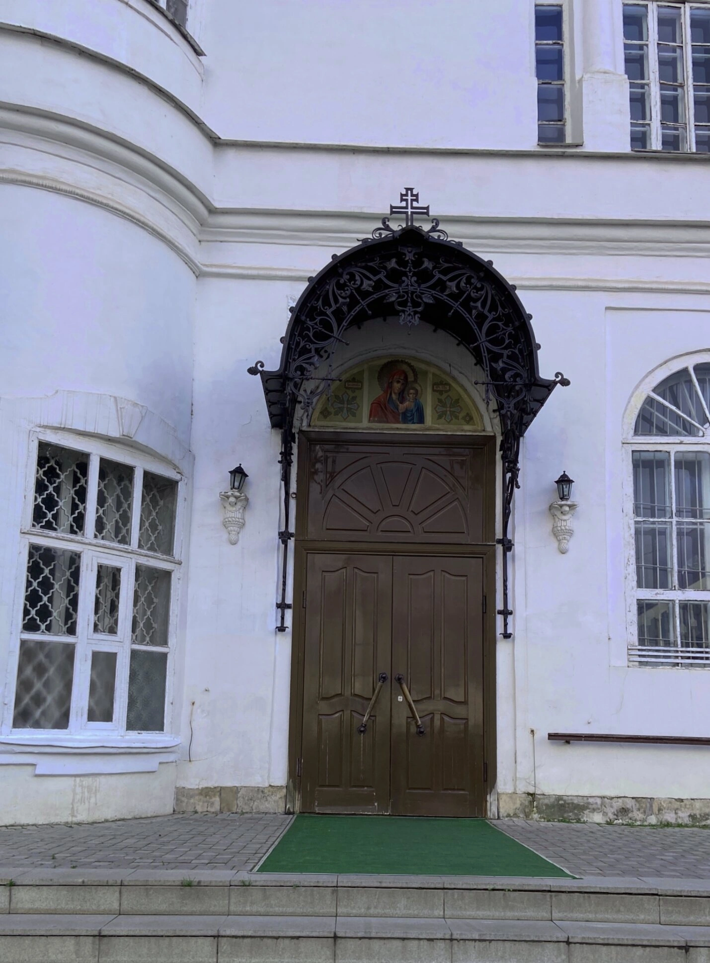 Над дверным проёмом под сенью ажурного металлического козырька, увенчанного православным крестом, располагается священное изображение — икона, на которой, по всей видимости, представлены небесные покровители. Этот козырёк чёрного цвета с тонким художественным литьём не только служит защитой от непогоды, но и является важным архитектурным акцентом, подчёркивающим значимость входа в Дом Божий.