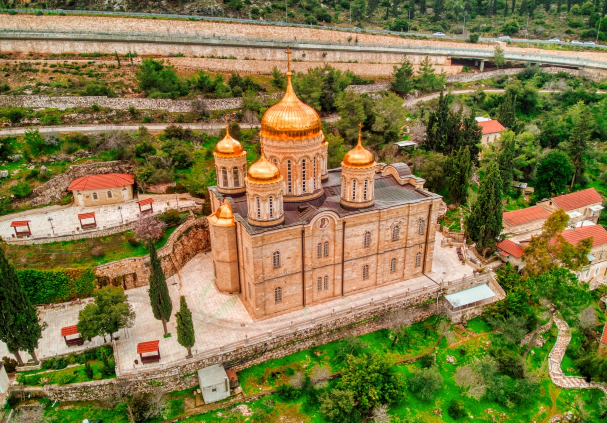 На снимке хорошо видно главное каменное здание монастырского храма, увенчанное пятью златоверхими куполами, символизирующими Господа Иисуса Христа и четырёх евангелистов. Центральный купол, превосходящий остальные по величине, сияет под ярким солнцем Святой Земли. Фасад храма, сложенный из светлого иерусалимского камня, украшен арочными оконными проёмами, что характерно для церковной архитектуры в этом регионе.