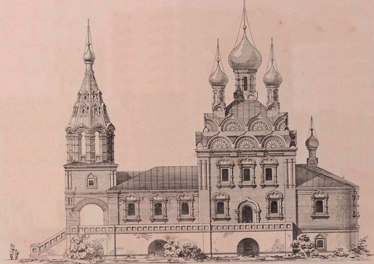 Гравюра выполнена с высочайшей точностью и позволяет рассмотреть все архитектурные особенности святого места. Храмовой комплекс состоит из основного объёма, увенчанного традиционным пятиглавием с луковичными маковками, и высокой шатровой колокольни, состоящей из нескольких ярусов. Фасад богато украшен характерным для эпохи узорочья декором: резными наличниками, поясами кокошников, карнизами сложного профиля и другими декоративными элементами, создающими праздничный и нарядный облик.