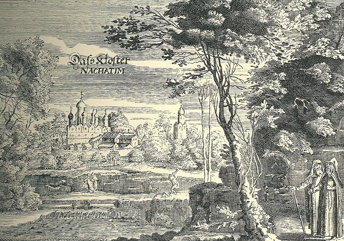 На представленной гравюре работы известного немецкого путешественника и учёного Адама Олеария запечатлён вид Спасо-Преображенского Хутынского монастыря, располагающегося вблизи Великого Новгорода на правом берегу реки Волхов. Монастырский комплекс, обозначенный на гравюре под названием «Dafs & Kloster NACHATIM», изображён в середине XVII столетия, что представляет огромную историческую ценность для изучения архитектурного облика святой обители в тот период.