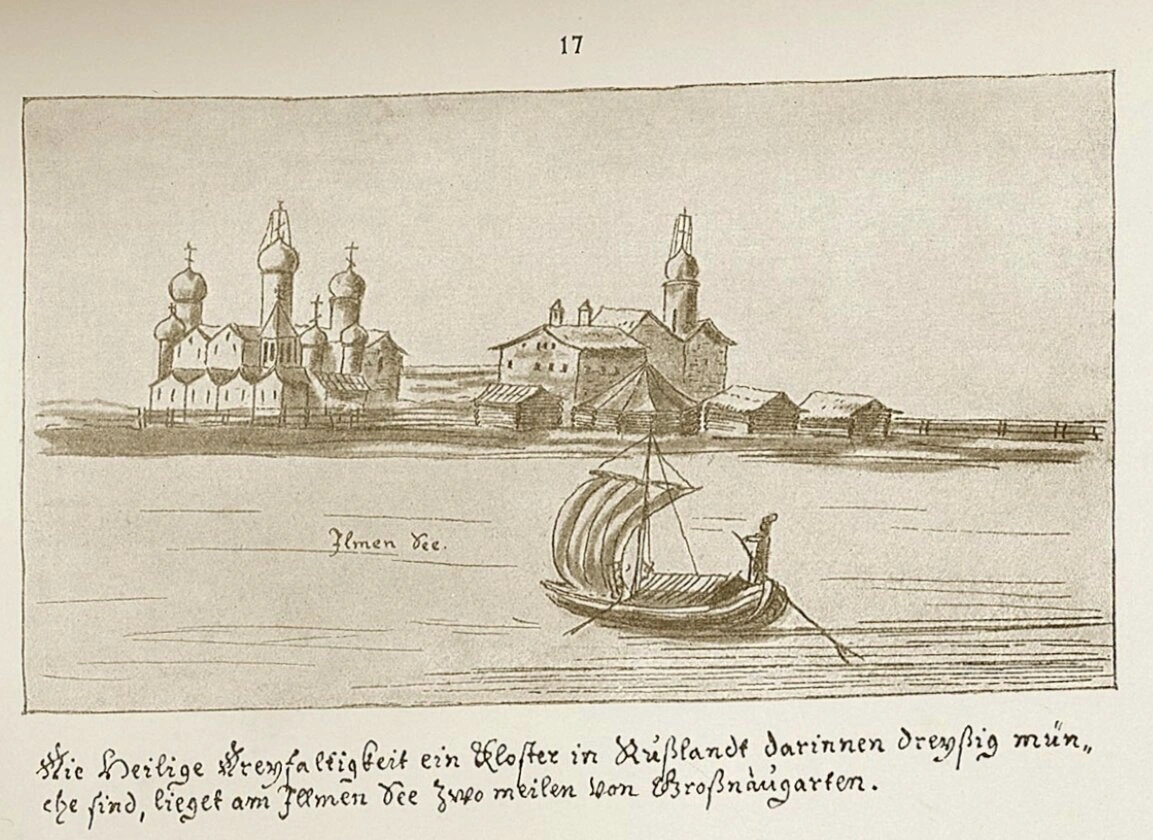 Немецкоязычная надпись в нижней части гравюры сообщает: "Die Heilige Dreyfaltigkeit ein Kloster in Rußlandt darinnen dreyßig mun, che sind, lieget am Ilmen dee zwo meilen von Großnäugarten", что переводится как "Монастырь Святой Троицы в России, в котором тридцать монахов, находится на озере Ильмень в двух милях от Великого Новгорода". Данная надпись указывает на международное признание русских православных обителей в Европе XVII века.