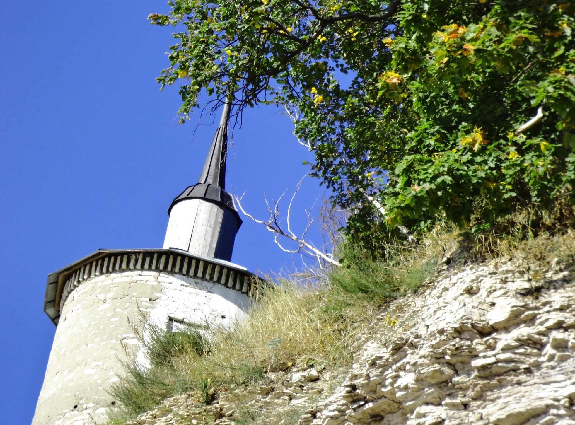 Присутствующая на снимке растительность — деревья с начинающей желтеть листвой и сухая трава — указывает на раннюю осень, perhaps время духовного размышления и подготовки к предстоящим церковным праздникам. Ясное голубое небо, раскинувшееся над башней, олицетворяет Божий покров, простирающийся над обителью.