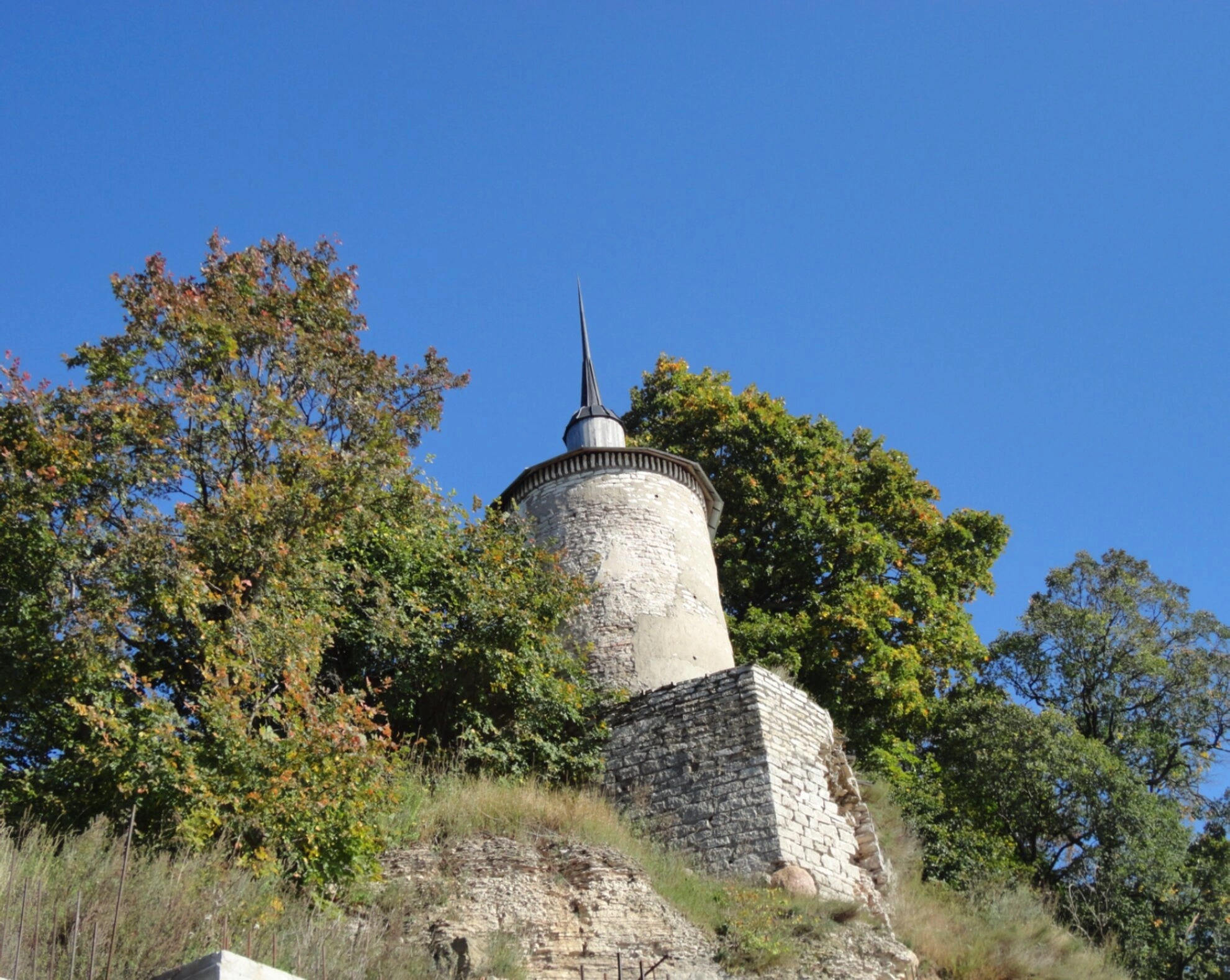 На представленной фотографии запечатлена историческая Гремячая башня, являющаяся частью ансамбля Снетогорского монастыря в древнем Пскове. Круглая каменная башня, увенчанная высоким коническим шпилем, возвышается на живописном холме, поросшем деревьями и кустарниками. Её мощные стены, сложенные из местного известняка, несут на себе следы многовековой истории и свидетельствуют о былом величии православной твердыни.