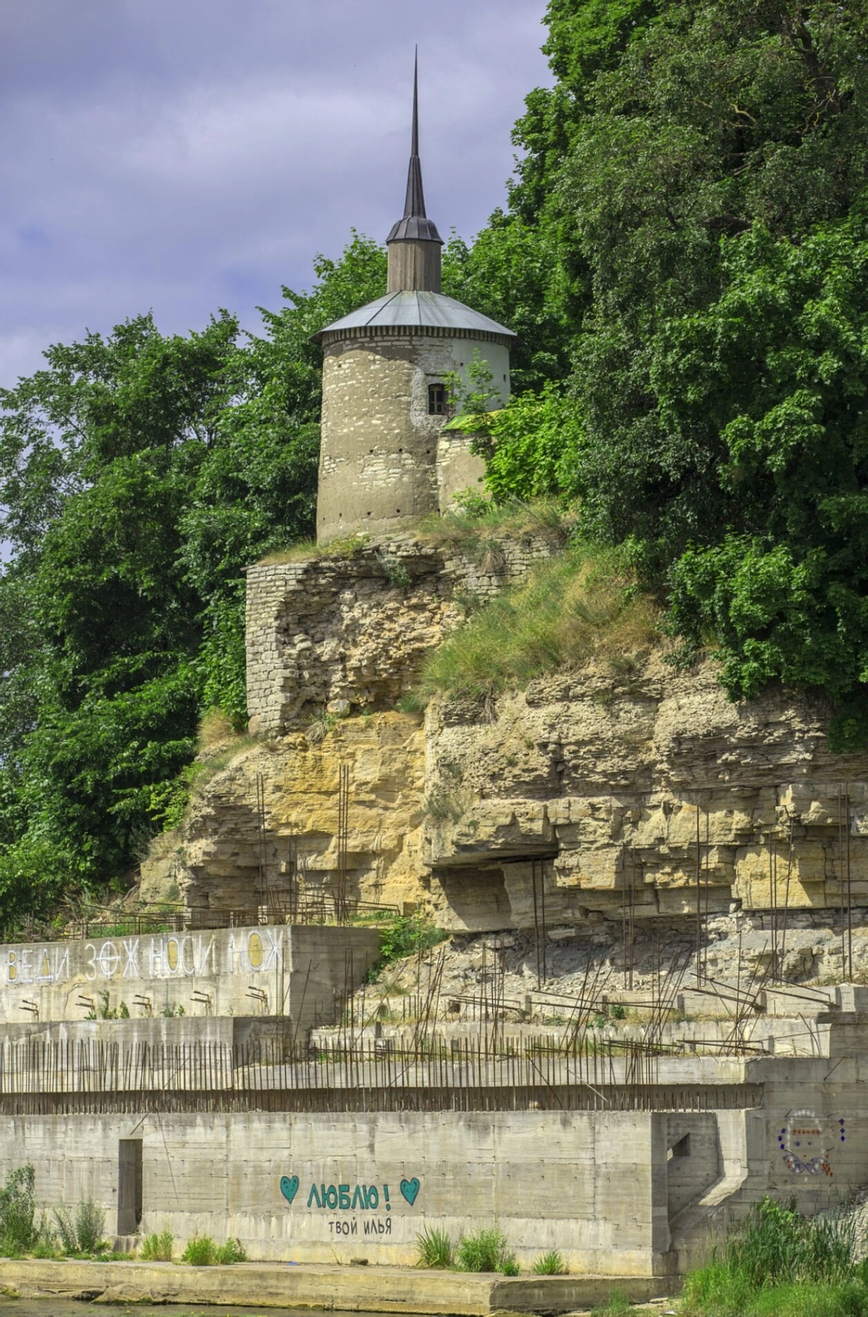 На представленной фотографии запечатлена историческая Гремячая башня, являющаяся частью ансамбля Снетогорского монастыря — одной из древнейших православных обителей Псковской земли. Монастырь, основанный в XIII веке, издревле являлся важным духовным центром и форпостом на подступах к граду Пскову.