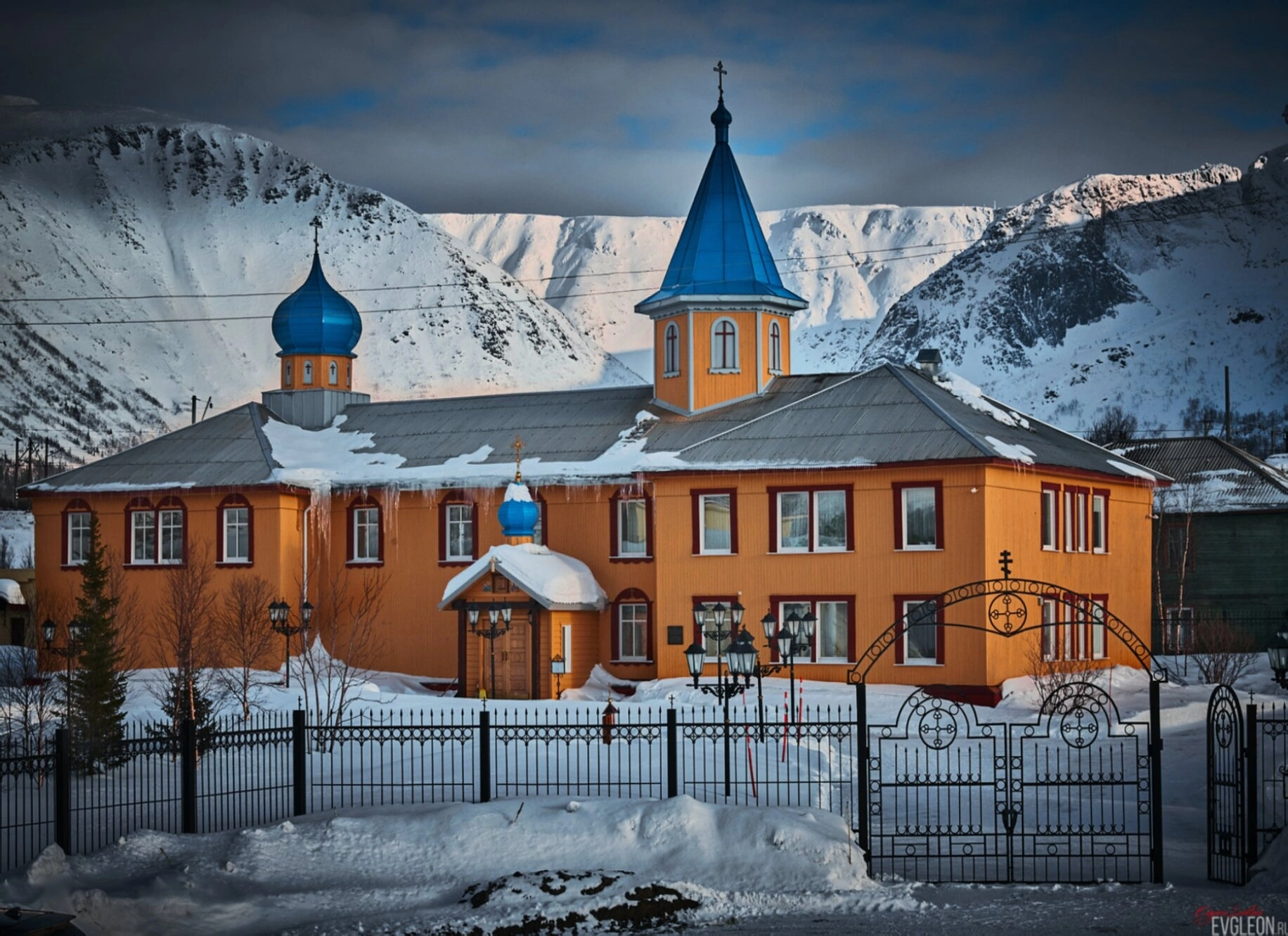 Чёрный ажурный кованый забор с вратами ограждает монастырскую территорию, символизируя переход от мира мирского к месту сугубой молитвы. На дальнем плане возвышаются заснеженные склоны Хибинских гор, подчёркивая удалённость и особую аскетичную красоту этой северной обители, возведённой для молитвенного подвига в суровых условиях Крайнего Севера.