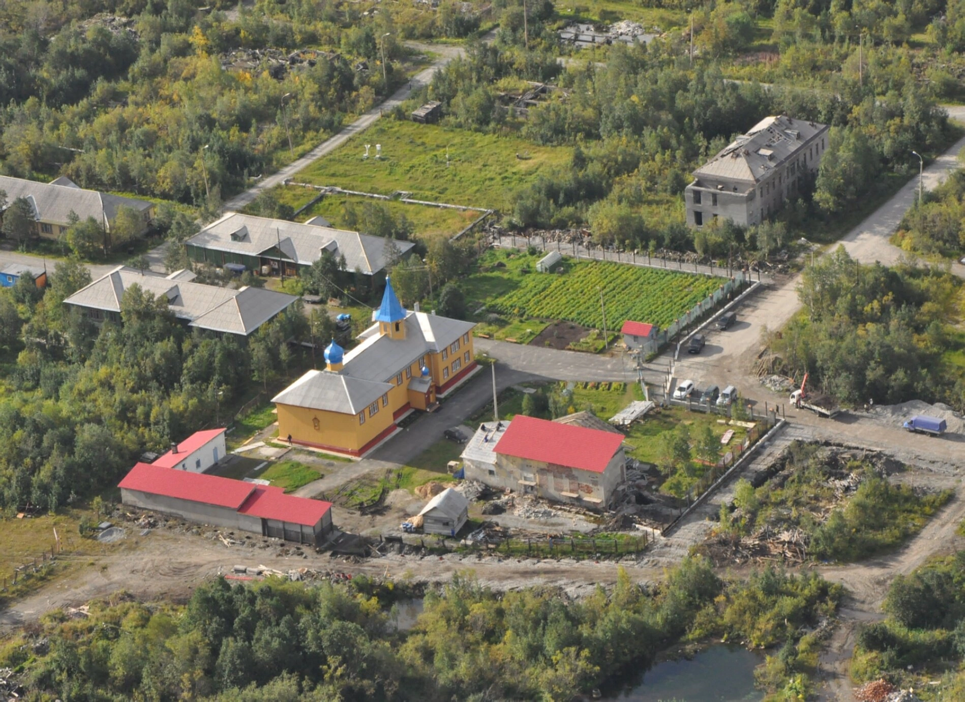 В центре фотографического изображения предстаёт главный храм монастыря, чьи ярко-жёлтые стены символизируют свет веры Христовой, а синие купола, увенчанные златоглавыми крестами, устремляются к небесам, напоминая о молитвенном предстоянии Богу. Архитектура храма выдержана в традициях русского церковного зодчества, что создаёт ощущение преемственности и связи со святой древностью.