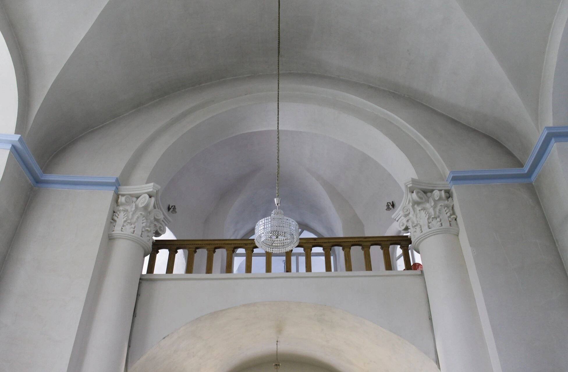 Взгляд невольно устремляется ввысь, к подкупольному пространству, где мощные своды опираются на массивные колонны с капителями. Арки и своды, выполненные в светлых тонах, украшены лаконичной голубой полосой, что добавляет интерьеру лёгкости и воздушности. Данный архитектурный облик характерен для русского церковного зодчества периода классицизма, в котором сочетаются монументальность и благодатная строгость.