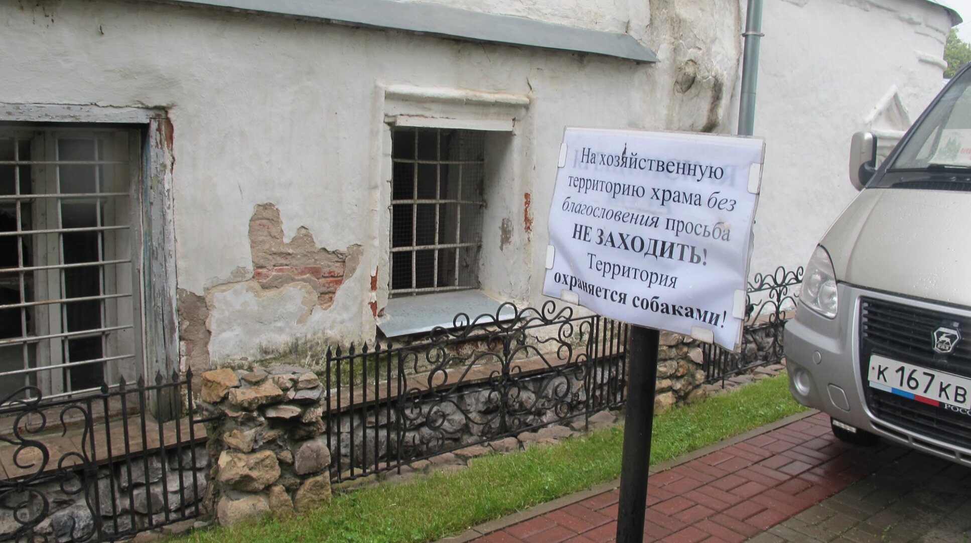 На переднем плане изображения хорошо видна табличка с предупреждающей надписью, которая гласит: «На хозяйственную территорию храма без благословения просьба НЕ ЗАХОДИТЬ! Территория охраняется собаками!». Это указание предназначено для обеспечения порядка и сохранности церковного имущества, а также для безопасности самих паломников и прихожан.