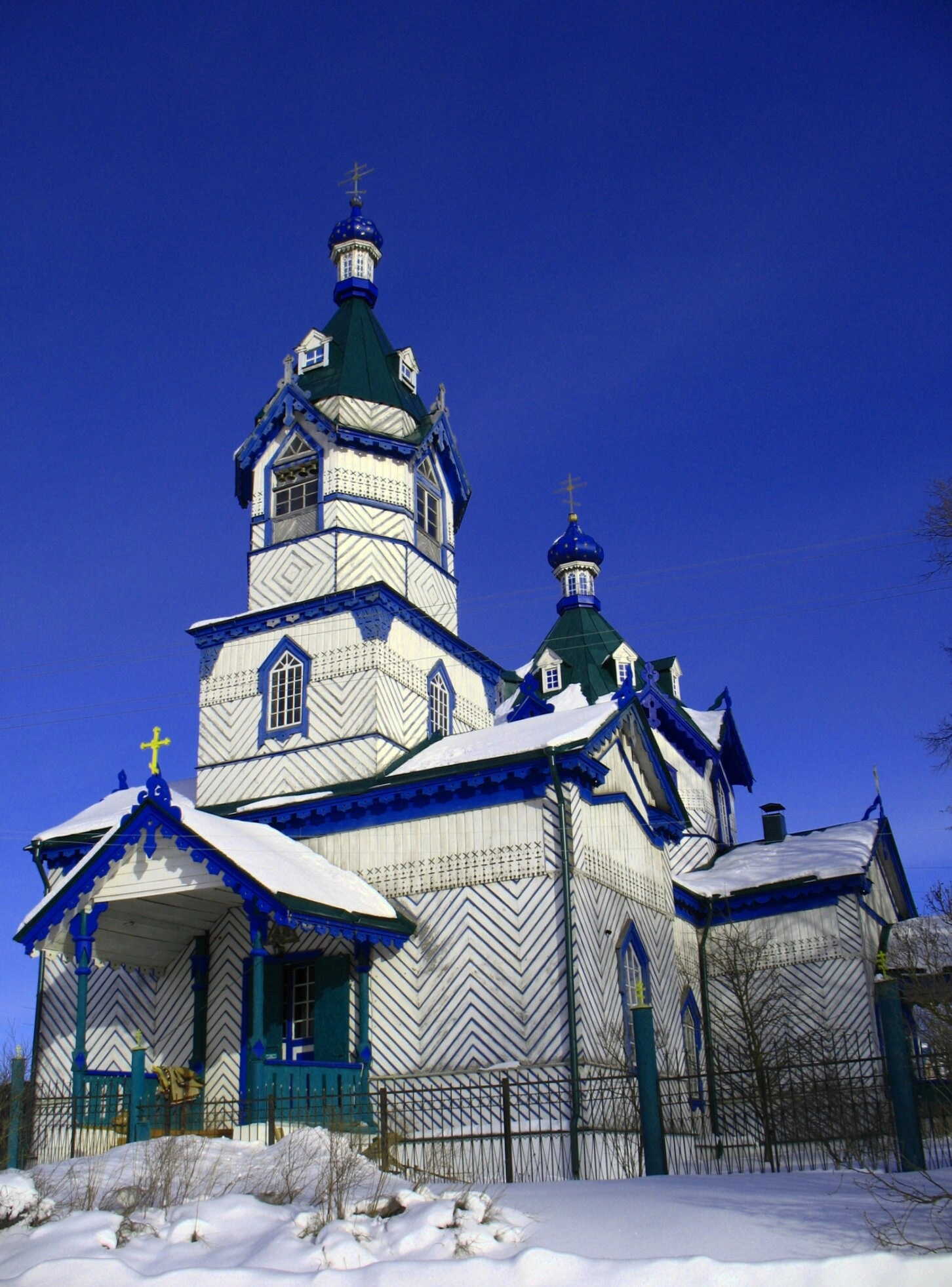 Снимок сделан в ясный зимний день. Глубокий снег окутывает землю вокруг церкви, а чистое голубое небо подчеркивает благолепие и нарядность святыни. Металлическая ограда обозначает границы церковной территории. Голые ветви деревьев, покрытые инеем, дополняют картину тихого и умиротворенного зимнего пейзажа, создавая атмосферу спокойствия и духовной сосредоточенности.