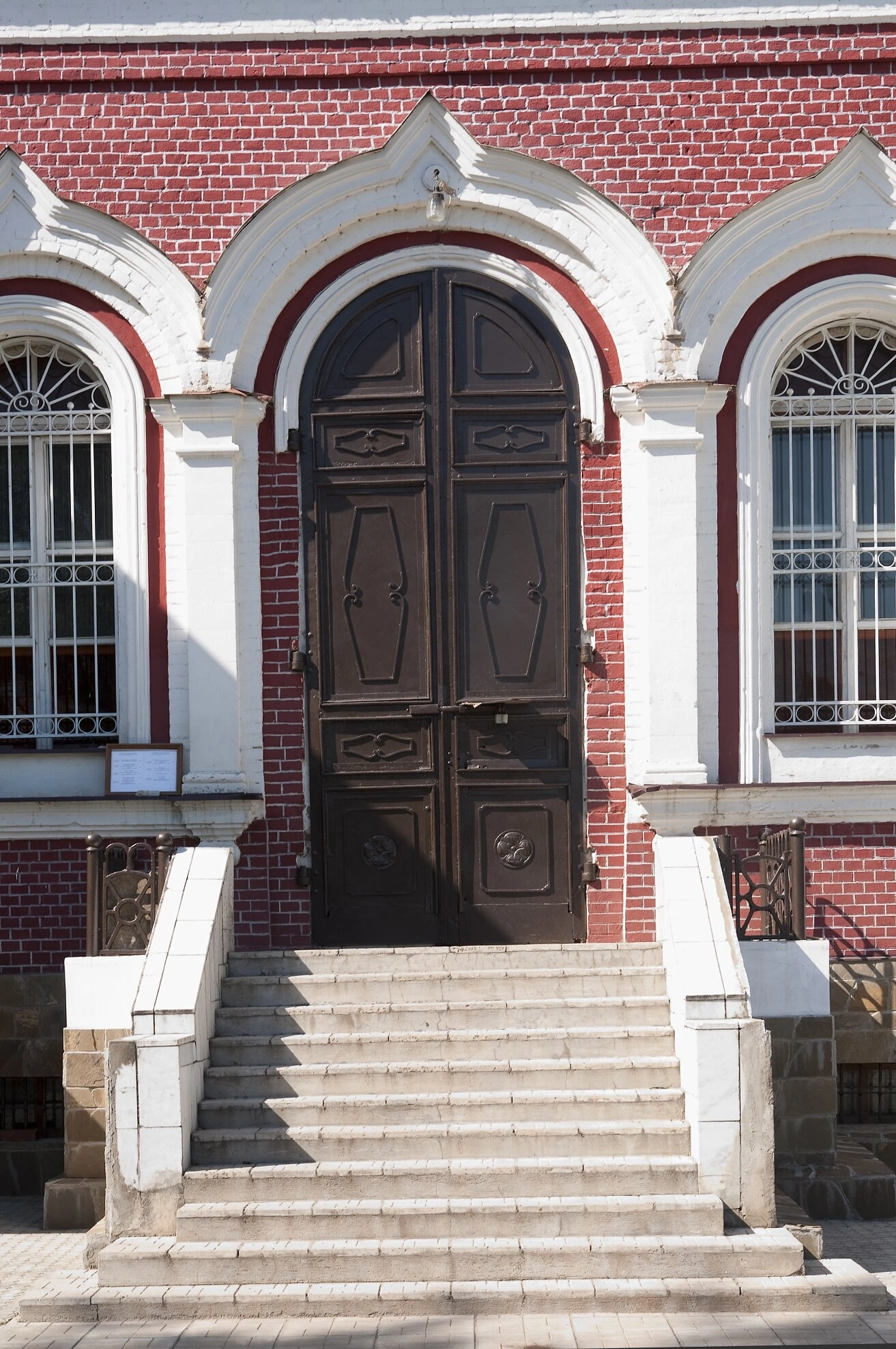 На фотографии запечатлен главный вход в храм преподобного Алексия, человека Божия, расположенный в городе Хотьково Московской области. Святыня находится по адресу: улица Горбуновская, дом 42, на территории бывшего села Горбуново. Архитектурный облик здания характеризуется благородным сочетанием красной кирпичной кладки стен и белокаменных декоративных деталей, что создает торжественный и нарядный вид. Входную группу обрамляют массивные деревянные двери, а к порталу ведет каменная лестница с изящными белыми перилами. По бокам от входа расположены арочные оконные проемы, защищенные коваными решетками.