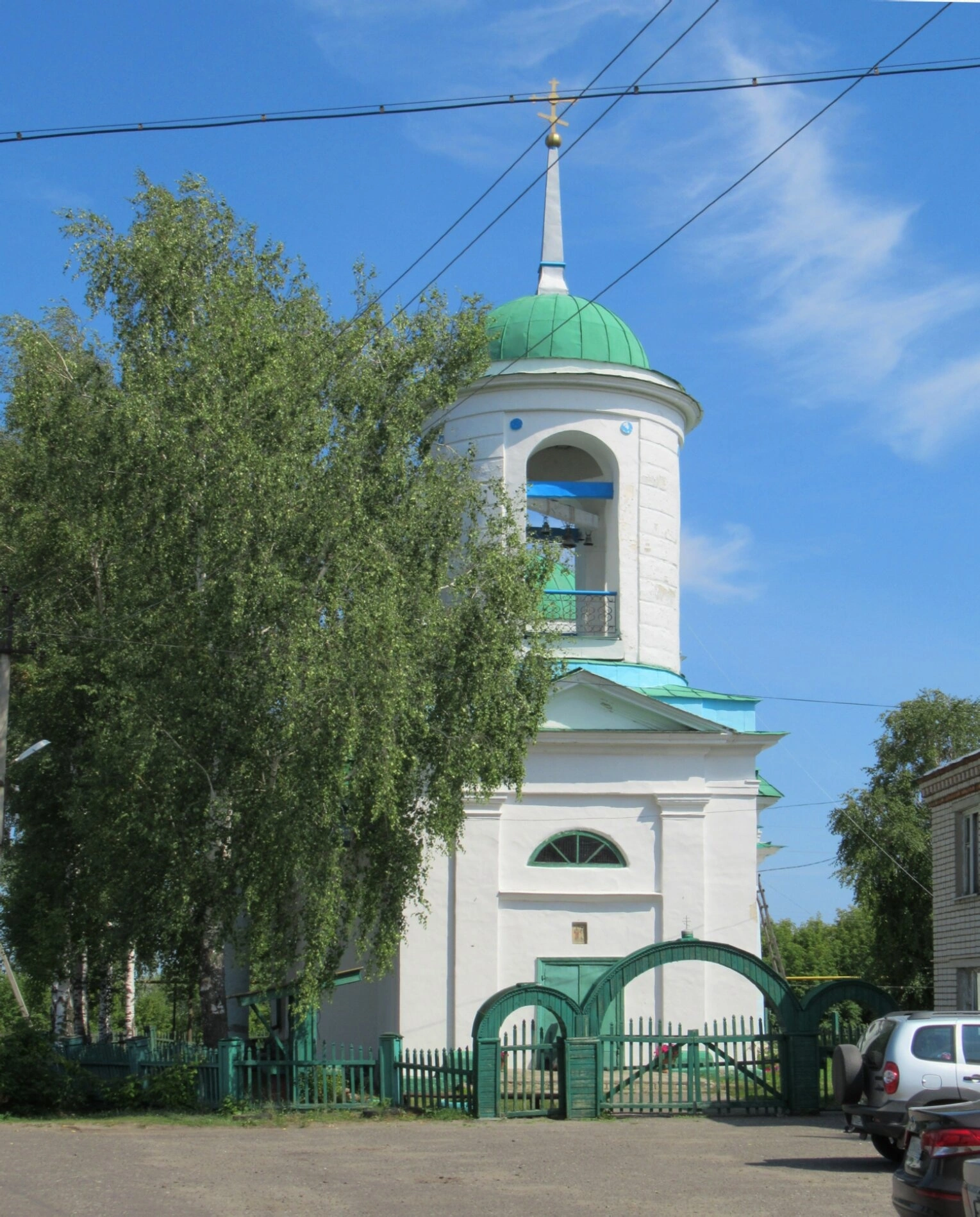 Окружающий пейзаж с берёзами, склонившими свои ветви у стен церкви, придаёт фотографии особый, истинно русский колорит и ощущение неразрывной связи православной веры с природой и историей этого края. Несмотря на присутствие в кадре элементов современности, таких как линии электропередач, образ храма сохраняет свою величавую духовную доминанту, продолжая осенять благодатью всех жителей и паломников, притекающих к этой святыне.