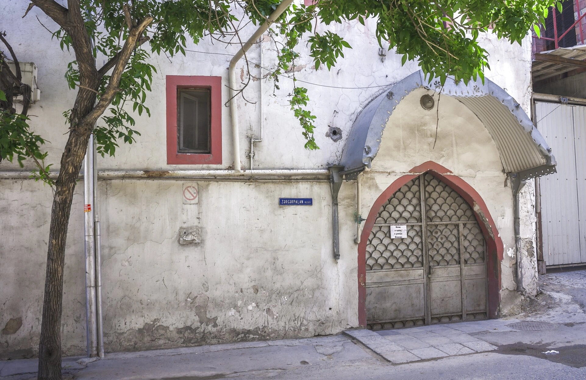 Мощёная поверхность перед храмом и небольшой пандус обеспечивают доступ верующим к святыне. Настенная табличка с надписью «ZARGARLAN», что в переводе означает «позолоченный», возможно, указывает на историческое название места или особенность утраченного ныне декора. Вся композиция снимка передаёт атмосферу тихого благоговения и духовной крепости, свойственной этому месту.