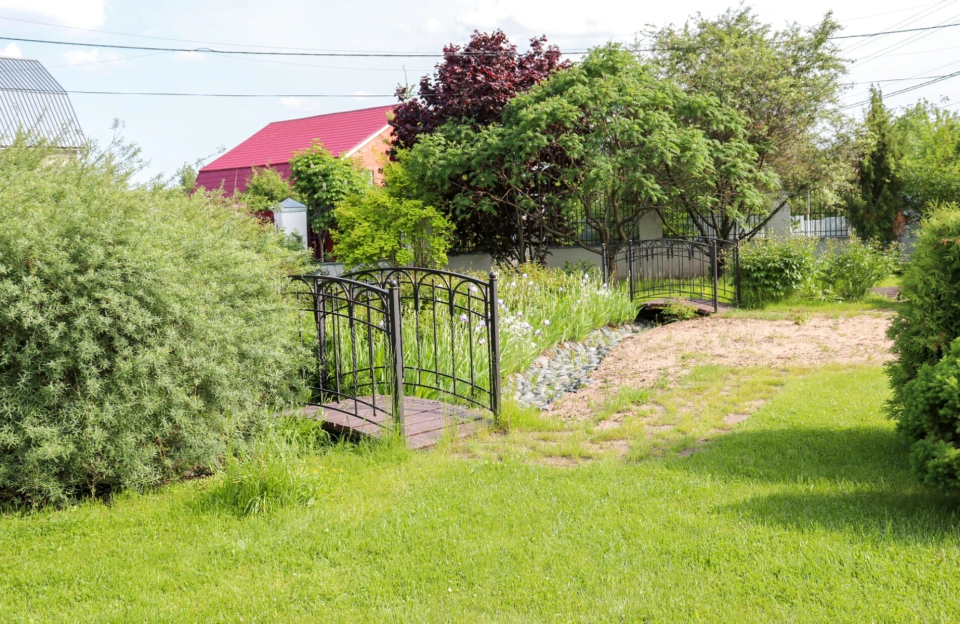 На представленной фотографии запечатлён живописный загородный пейзаж в окрестностях храма Архангела Михаила в деревне Летово. На переднем плане виден ухоженный сад с декоративным деревянным мостом, перекинутым через небольшой ручей. Окружающие деревья создают ощущение уединённости и покоя. На заднем плане просматривается дом с красной крышей, что добавляет кадру домашнего уюта. Хотя сам храм на снимке не виден, фотография передаёт атмосферу тихого, благодатного места, где находится этот православный памятник.