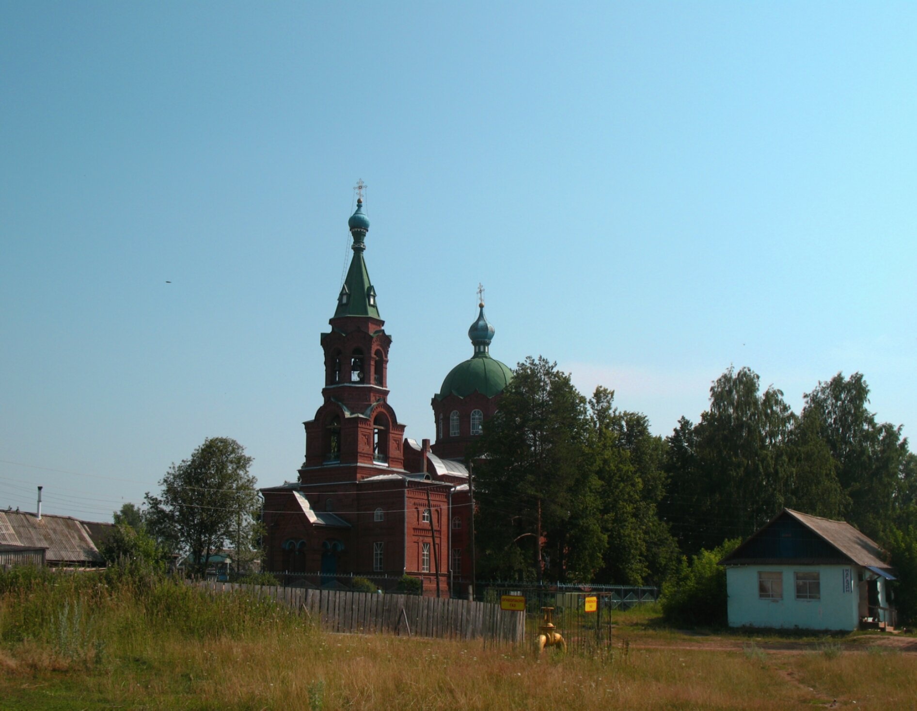На представленной фотографии запечатлён старинный православный храм в честь святого Архистратига Михаила, расположенный в селе Сям-Можга Удмуртской Республики. Величественное кирпичное здание с высокой колокольней и зелёными куполами, увенчанными золочёными крестами, доминирует в окружающем сельском пейзаже. Храм эффектно выделяется на фоне ясного голубого неба, а его светлые стены гармонично сочетаются с зеленью деревьев, окружающих церковный двор.