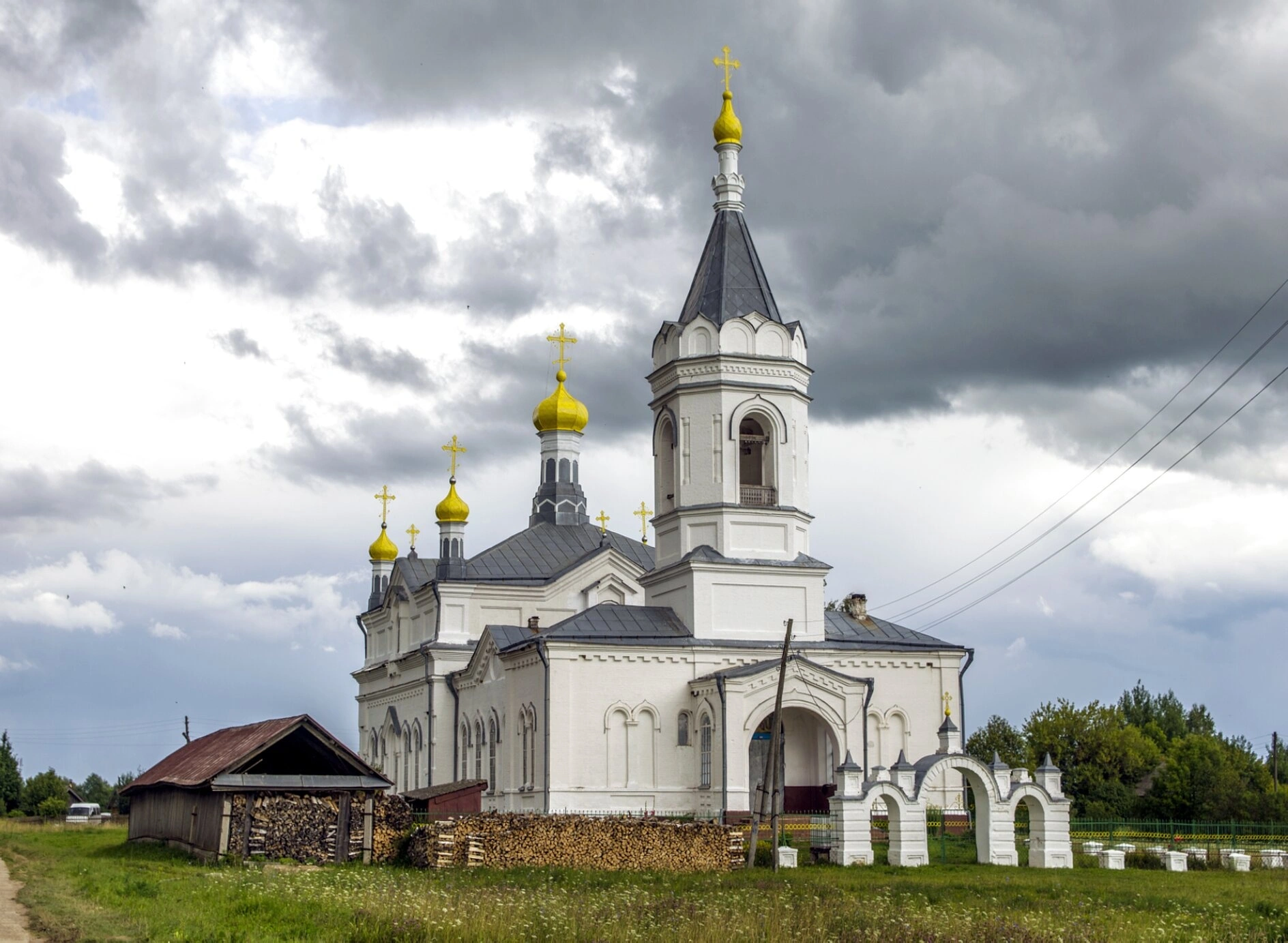 Храм гармонично вписан в окружающий богоданный пейзаж. Его окружают тенистые деревья и зелёные луга, подчёркивая единение творения рук человеческих с Божьим миром. На переднем плане видны аккуратно сложенные дрова, что свидетельствует о попечении и заботе местной общины о своей святыне. Небольшое деревянное строение, возможно, часовня или хозяйственная постройка, дополняет ансамбль.