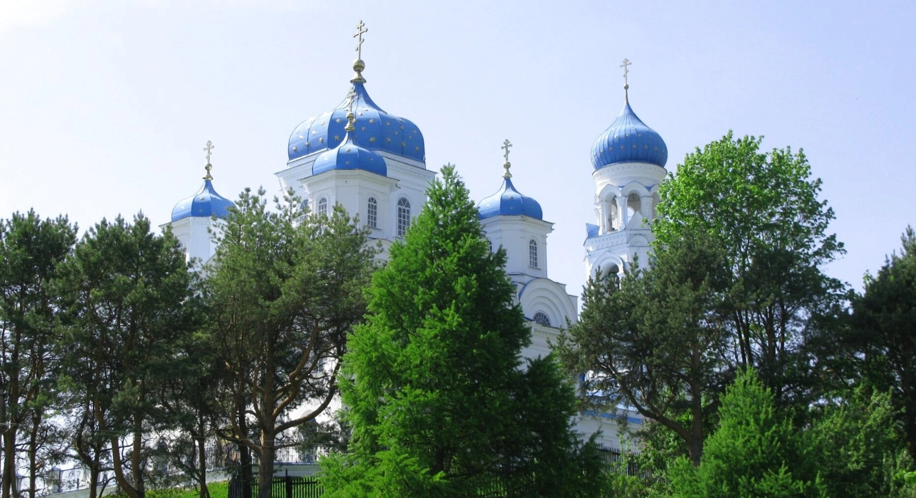 На фотографии запечатлён величественный храм в честь Архангела Михаила, расположенный в древнем городе Торжке Тверской области. Белоснежные стены церкви и ярко-голубые купола с сияющими крестами создают образ небесной чистоты и благодати, гармонично вписанный в окружающий природный ландшафт.