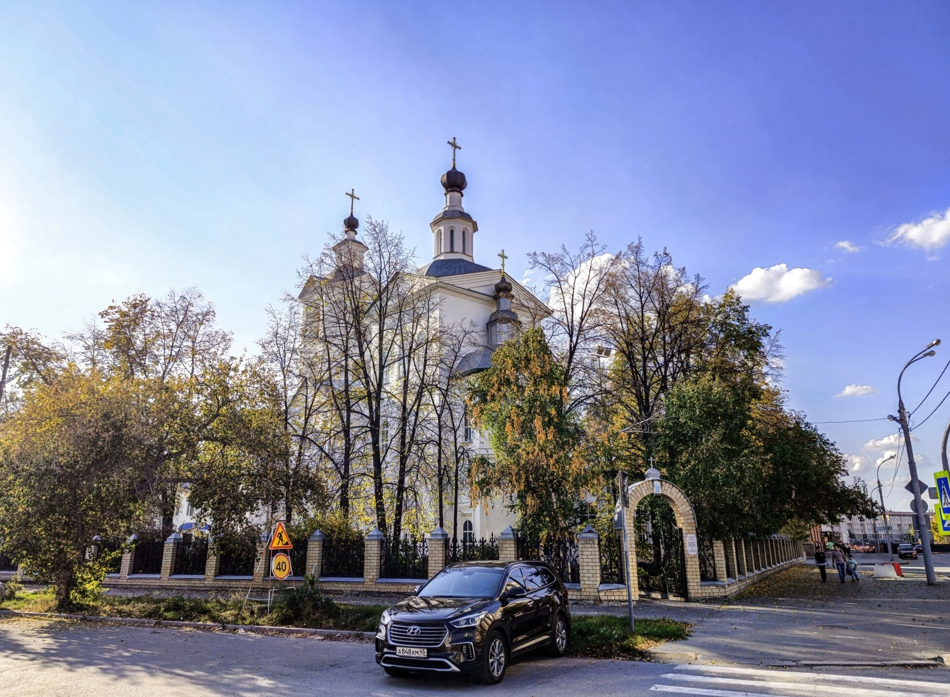 Территория вокруг храма благоустроена и ограждена, что видно по аккуратной ограде и украшающему вход арочному проёму. Зелёные насаждения — деревья и кустарники — обрамляют церковный двор, придавая ему ухоженный и спокойный вид. На переднем плане фотографии виднеется припаркованный автомобиль и пешеходный переход, что свидетельствует о расположении святого места в оживлённой городской среде, где духовная жизнь неразрывно связана с мирской суетой.