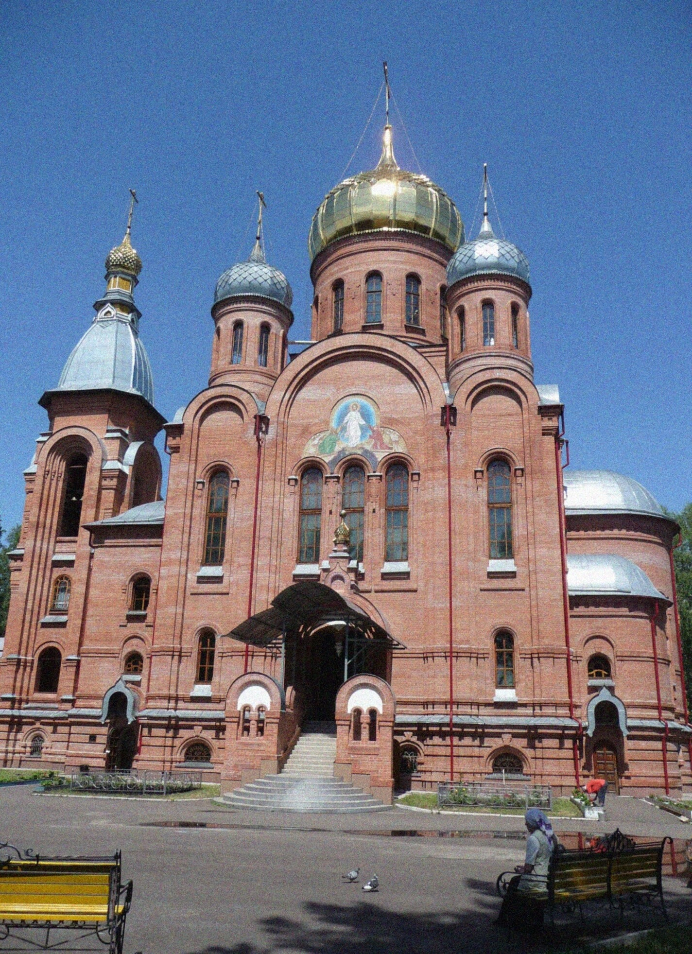 Перед входом в дом Божий расположена благоустроенная площадь с лавочками, где прихожане могут отдохнуть. На фотографии запечатлён мирный быт: на одной из лавочек сидит человек, а на другой расположились голуби, что придаёт снимку особую живость и одухотворённость.