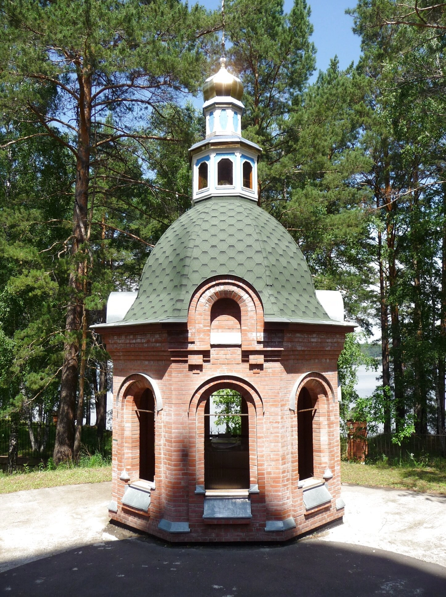 На представленной фотографии запечатлён храм в честь святого Архистратига Михаила, расположенный в городе Железногорске Красноярского края. Святыня, возведённая из красного кирпича, представляет собой прекрасный образец современного православного зодчества, гармонично вписавшегося в природный ландшафт сибирской тайги.