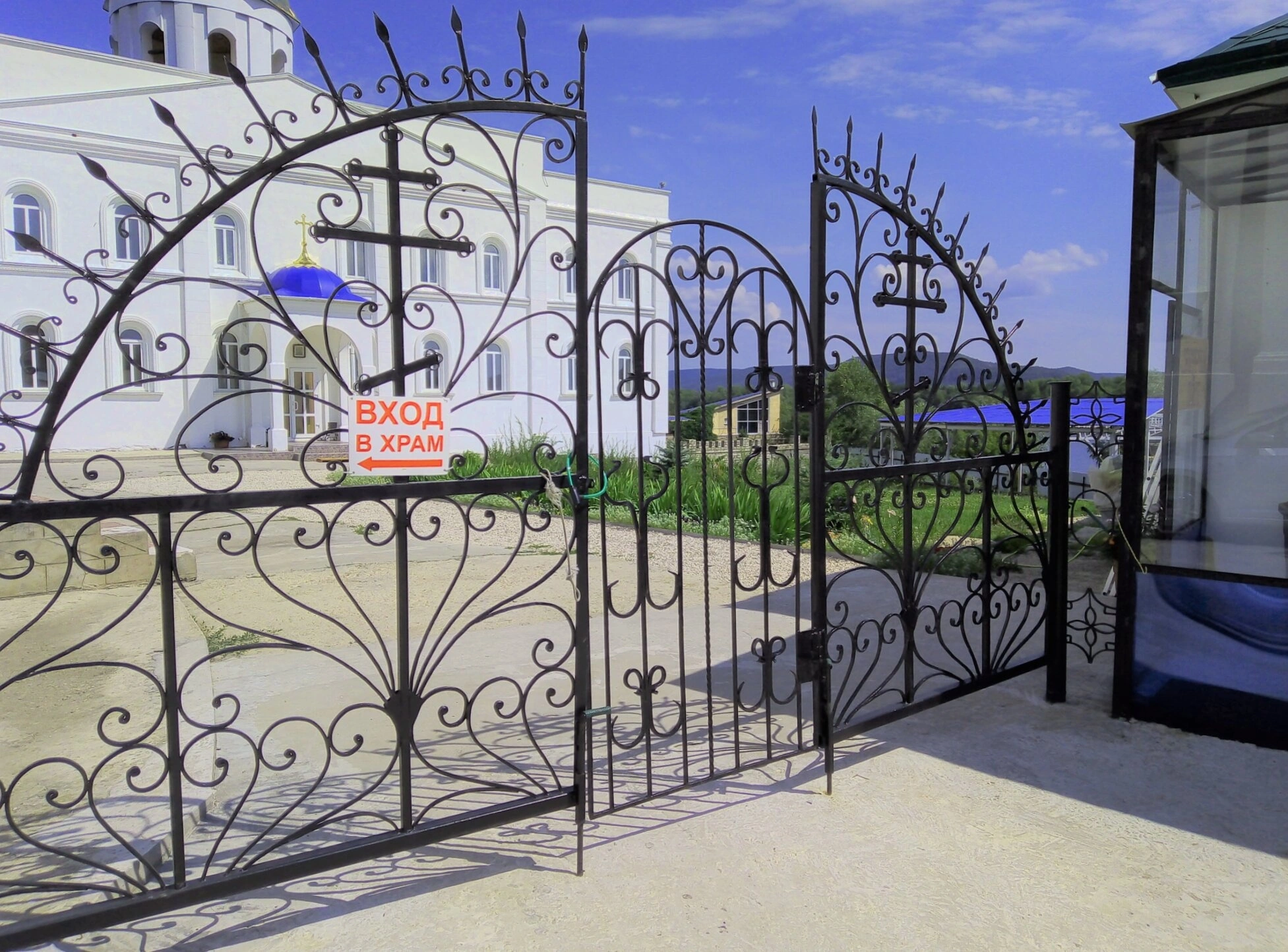 На фотографии запечатлен главный вход в храм Благовещения Пресвятой Богородицы, расположенный в городе Тольятти. Кованые металлические ворота и калитка, украшенные декоративными элементами с крестами и растительными узорами, приветствуют прихожан и паломников. Четко видна табличка с надписью «ВХОД В ХРАМ», указывающая путь в дом Божий.