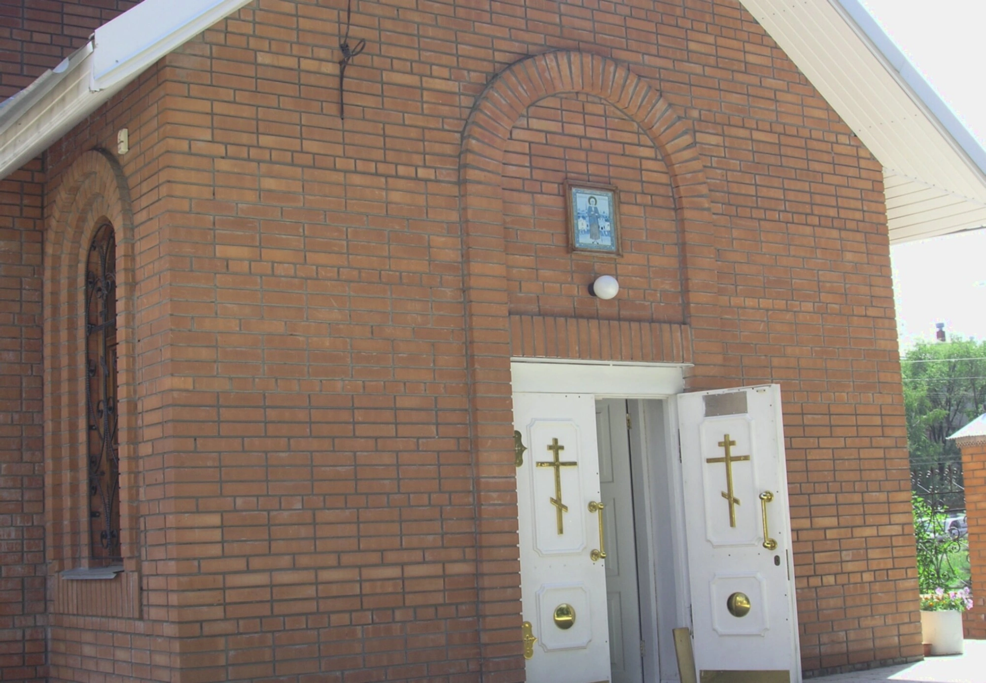 Слева от входа расположено арочное окно, защищённое кованой решёткой, через которое в священное пространство храма проникает естественный свет. Здание венчает скатная кровля светлого оттенка, что придаёт всему облику храма устремлённость ввысь и лёгкость. Справа от здания виден фрагмент ограды с кирпичным столбом и зелеными насаждениями, что подчёркивает ухоженность и благообразие святого места.