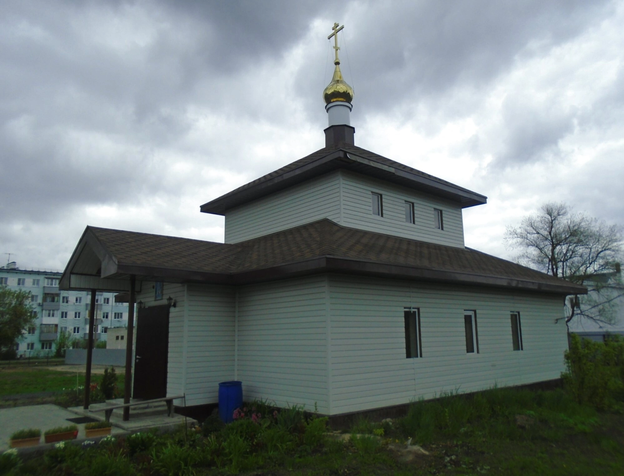 Архитектура храма отличается скромностью и практичностью, характерной для современных приходских построек в городской среде. Прямоугольные окна пропускают свет в молитвенное пространство, а с левой стороны к зданию примыкает крыльцо с отдельным навесом, ведущее к входной двери. Рядом с крыльцом виден синий бытовой бочонок, что указывает на повседневную жизнь прихода. На заднем плане чётко просматриваются многоэтажные жилые дома, что подчёркивает интеграцию храма в современный городской ландшафт и его доступность для жителей района.