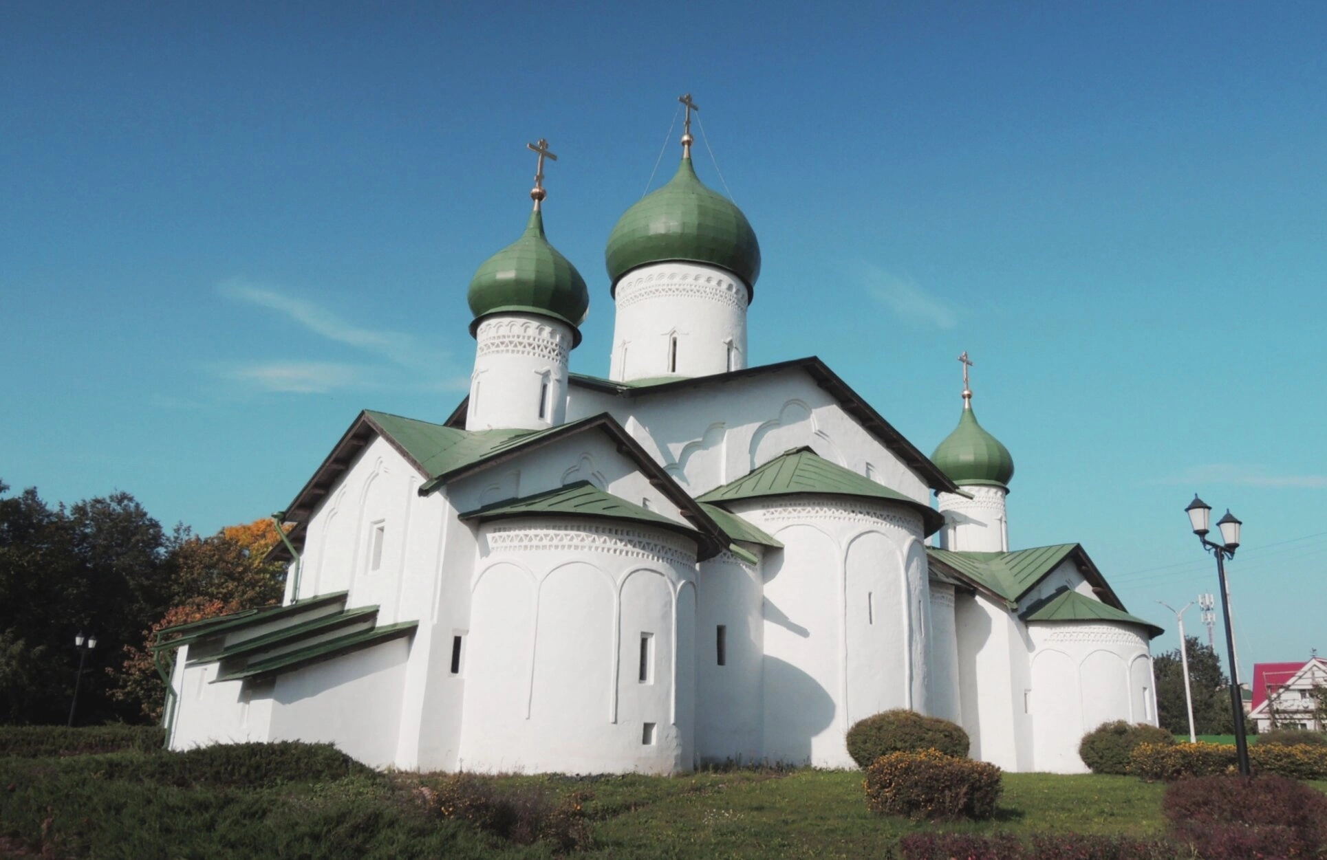 На представленной фотографии запечатлён величественный православный храм — Церковь Богоявления Господня с Запсковья, расположенная в историческом центре Пскова на правом берегу реки Псковы. Этот выдающийся памятник древнерусского зодчества был возведён в 1496 году на месте более раннего деревянного храма и является одним из ярчайших образцов псковской архитектурной школы.