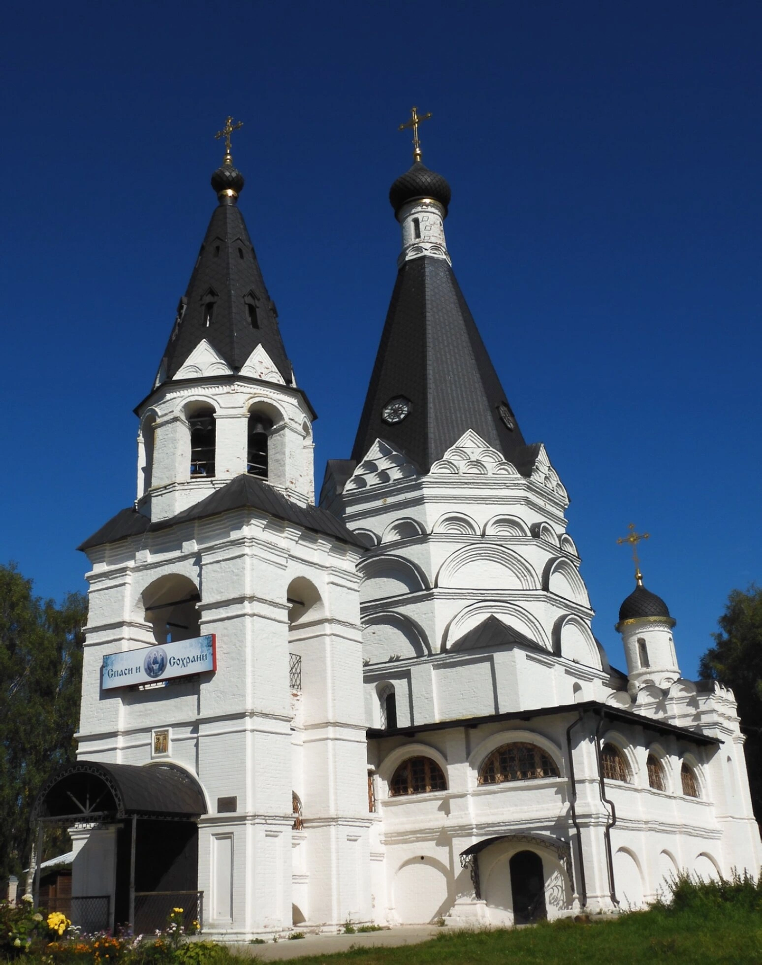 Фасады церкви украшены богатым декором: аркатурные пояса, наличники, килевидные закомары и другие элементы, характерные для храмового строительства. На одном из строений у входа можно различить табличку с наименованием. Святыня располагается на ухоженном зелёном газоне, а окружающие её деревья и ясное голубое небо подчёркивают её благолепие и величие.