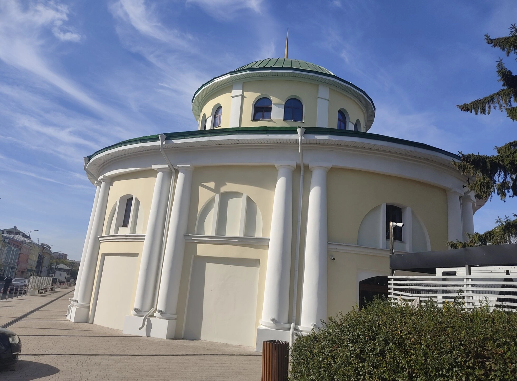 На представленной фотографии запечатлён храм Богоявления Господня, расположенный в историческом центре Рязани, неподалёку от Соборной площади. Этот православный храм, являющийся объектом культурного наследия, представляет собой великолепный образец архитектуры классицизма. Здание выполнено в форме ротонды — монументальной постройки круглого плана, что является редким и выдающимся решением для церковной архитектуры региона.