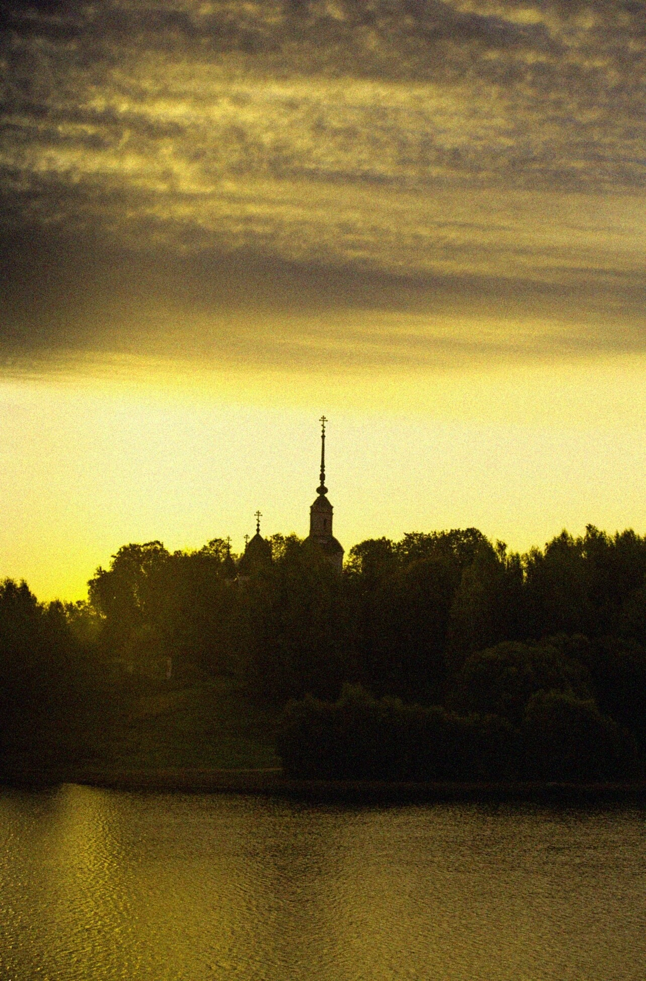 На представленной фотографии запечатлён величественный силуэт Богоявленского храма, расположенного в старинном селе Семендяево Угличского района Ярославской области. Святыня живописно возвышается на холме, у самого берега вод Волги, которая здесь исполняет роль символического водоёма, отражая вечерние небеса. Архитектурный облик церкви, чётко прорисовывающийся на фоне уходящего за горизонт солнца, создаёт ощущение благоговейного покоя и вечности.