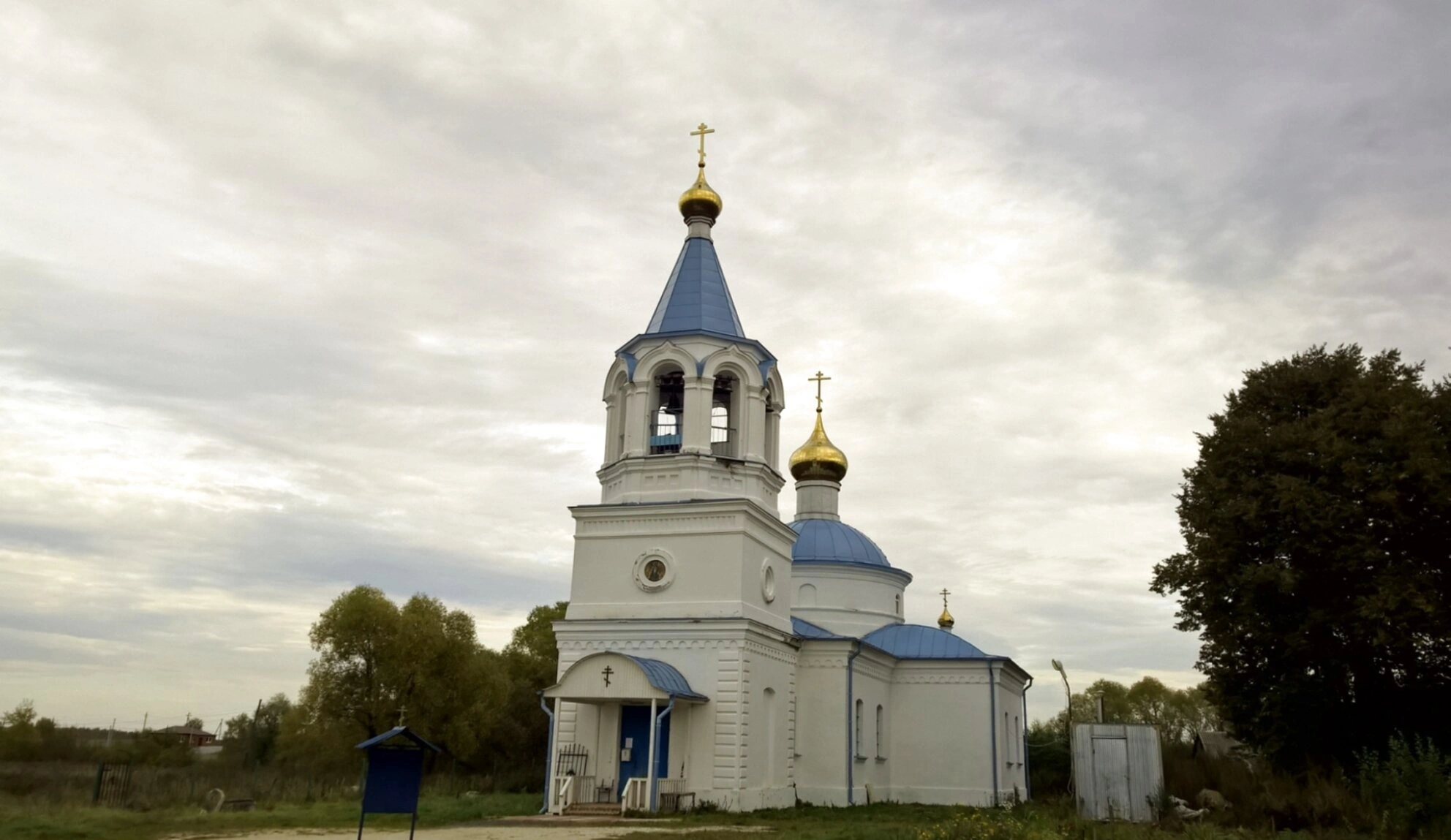 На снимке храм предстает в окружении скромного сельского пейзажа: вековые деревья, служащие естественным обрамлением для святыни, и простое ограждение подчеркивают уединенность и молитвенную атмосферу этого места. Небесный фон с легкими облаками добавляет фотографии ощущение божественного присутствия и благоговейного спокойствия.