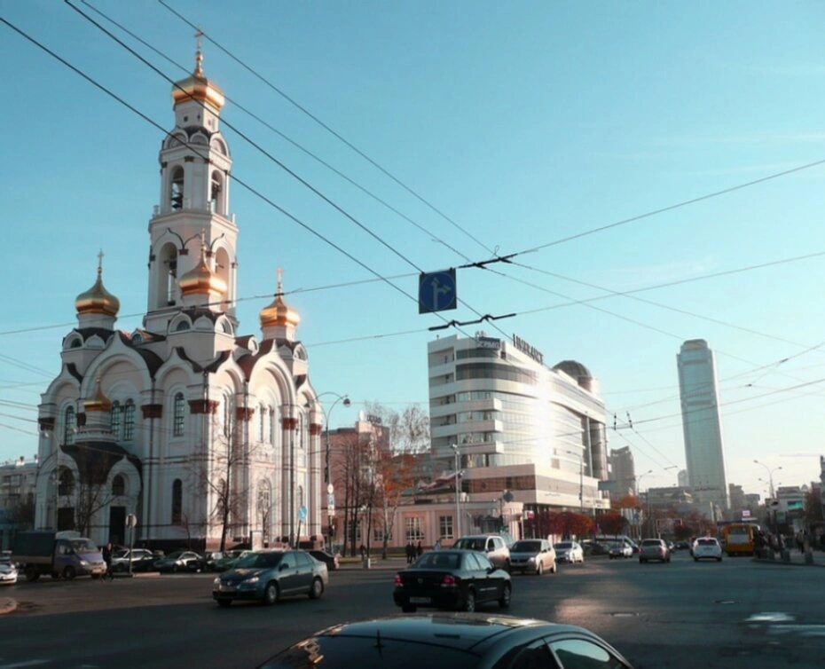 На переднем плане фотографии видна оживлённая городская улица, являющаяся свидетельством повседневной жизни града. Движение автомобилей и троллейбусные провода подчёркивают динамику современного Екатеринбурга, в сердце которого возрождён православный символ. Справа от храма просматриваются контуры современных зданий, включая торговый комплекс, что создаёт уникальное противопоставление между духовным наследием и новым временем.