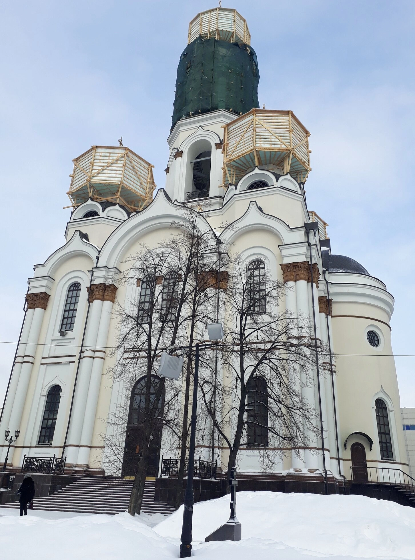 Архитектурный облик храма, выполненный в русско-византийском стиле, гармонично сочетает монументальность и изящество. Центральный золочёный купол, традиционно символизирующий Христа, окружён более мелкими главами. На момент съёмки купола находятся на реставрации, о чём свидетельствуют установленные строительные леса — знак непрекращающейся заботы о сохранении духовной жемчужины Урала.