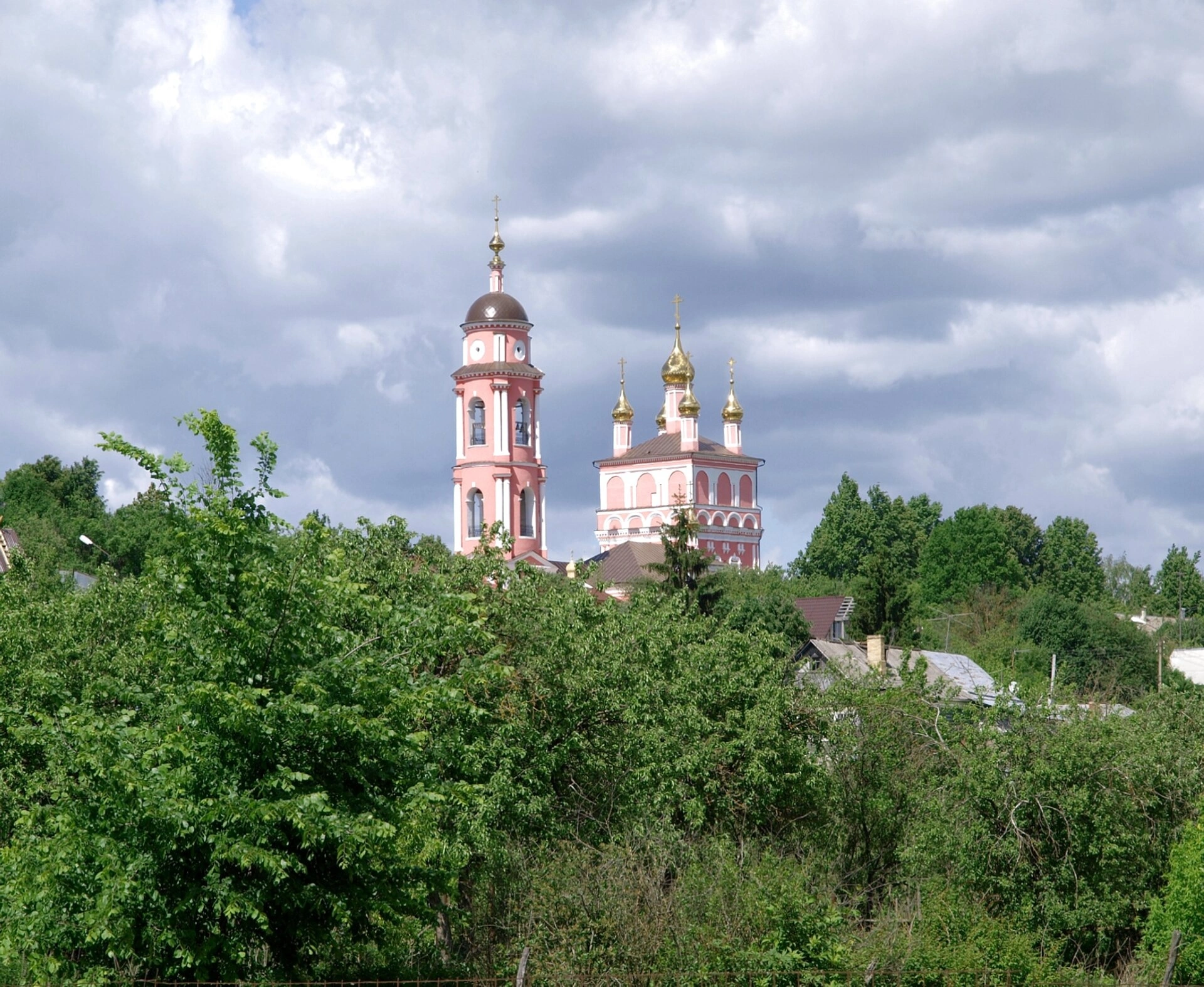 На переднем плане видны густые ветви деревьев, сквозь которые проступают очертания церковных построек, выполненных в тёплых розовато-красных тонах. Центральное место в архитектурной группе занимает основной храм, увенчанный сияющими на солнце золочёными главами, которые символизируют горний мир и устремление верующих к Небесному Царству. Рядом возносится к небу стройная шатровая колокольня, являющаяся неотъемлемой частью православного храмового комплекса.