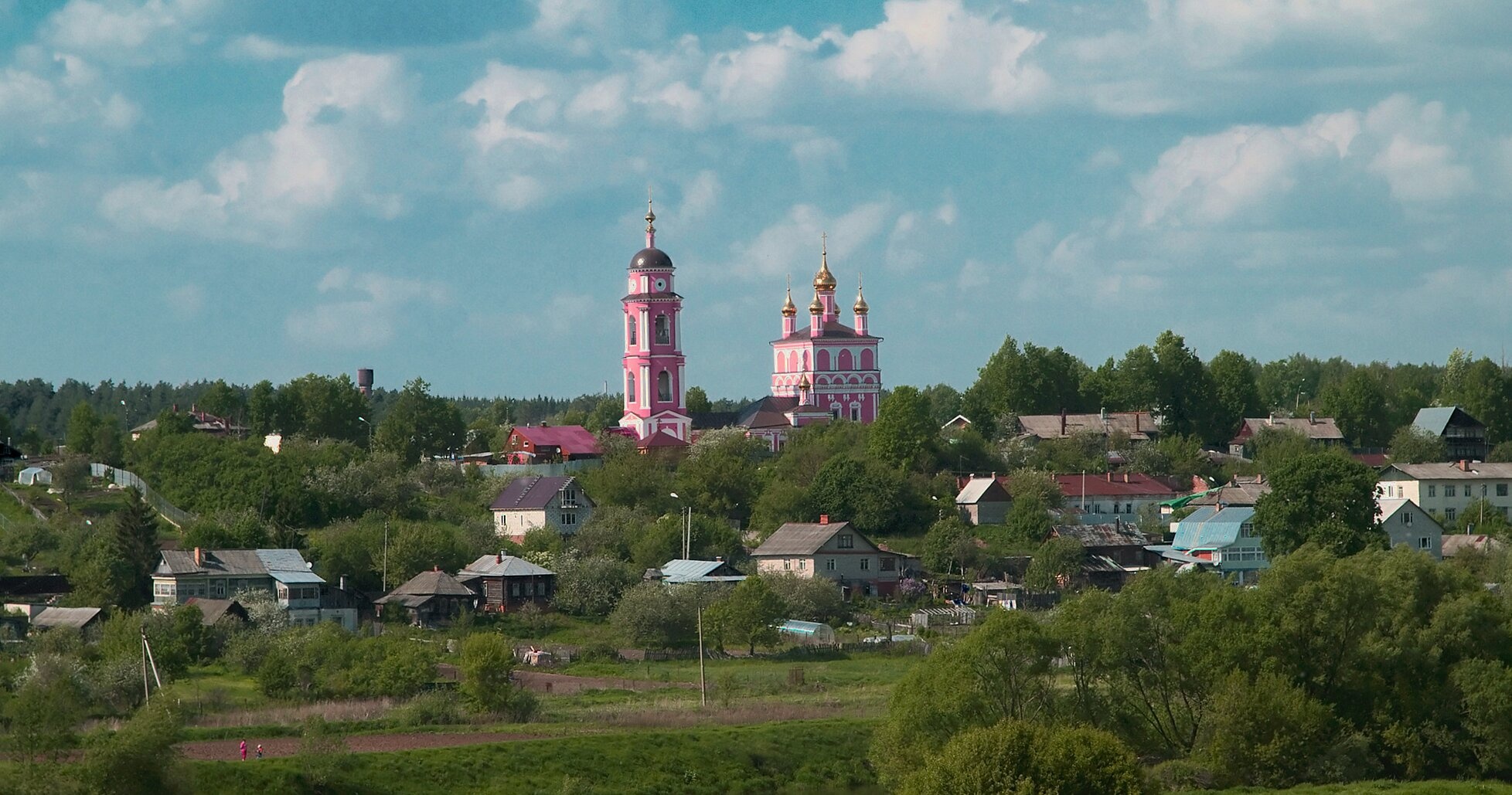 На представленной фотографии запечатлен величественный вид на старинный город Боровск Калужской области, открывающийся с живописного склона берега реки Протвы. Центральным элементом панорамы выступает святая православная обитель — храм во имя святых страстотерпцев Бориса и Глеба. Его розовые стены, увенчанные сияющими на солнце золотыми куполами, создают яркий духовный акцент в спокойном пейзаже провинциального русского города.