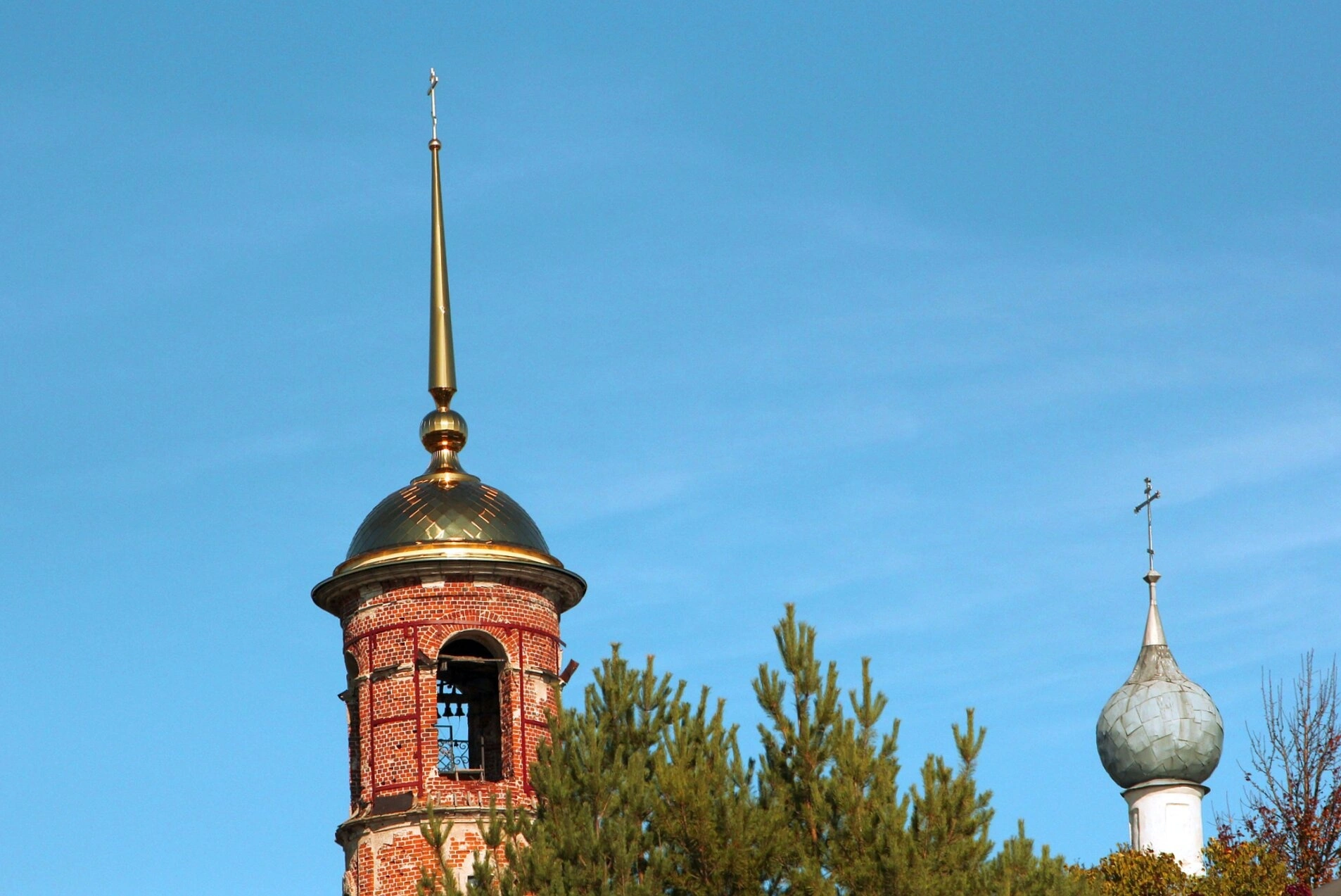 На фотографии запечатлён ансамбль храма в честь святых благоверных князей-страстотерпцев Бориса и Глеба, что в селе Дракино Серпуховского района Московской области. На переднем плане величественно возвышается многоярусная колокольня, выполненная из красного кирпича и увенчанная золочёной главкой с высоким шпилем, на котором установлен православный крест, сияющий в лучах солнца. Нижний ярус колокольни частично скрывает благодатная зелёная листва деревьев, обрамляющих святое место.
