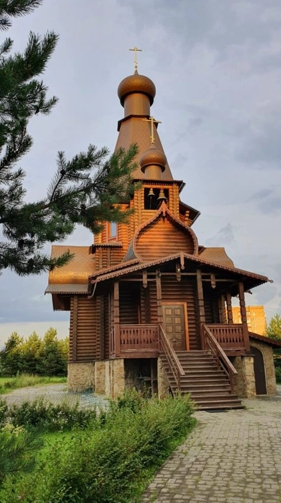 Первая Божественная литургия в строящемся храме была отслужена 12 ноября 2011 года. С 2012 года при храме действует воскресная школа для детей, где занятия проводятся после литургии. На фотографии, сделанной в пасмурный день, храм предстаёт не просто как архитектурный объект, а как живой центр духовного притяжения, воплощение соборного труда и молитвы, продолжающий традиции православного деревянного зодчества в современном мире.