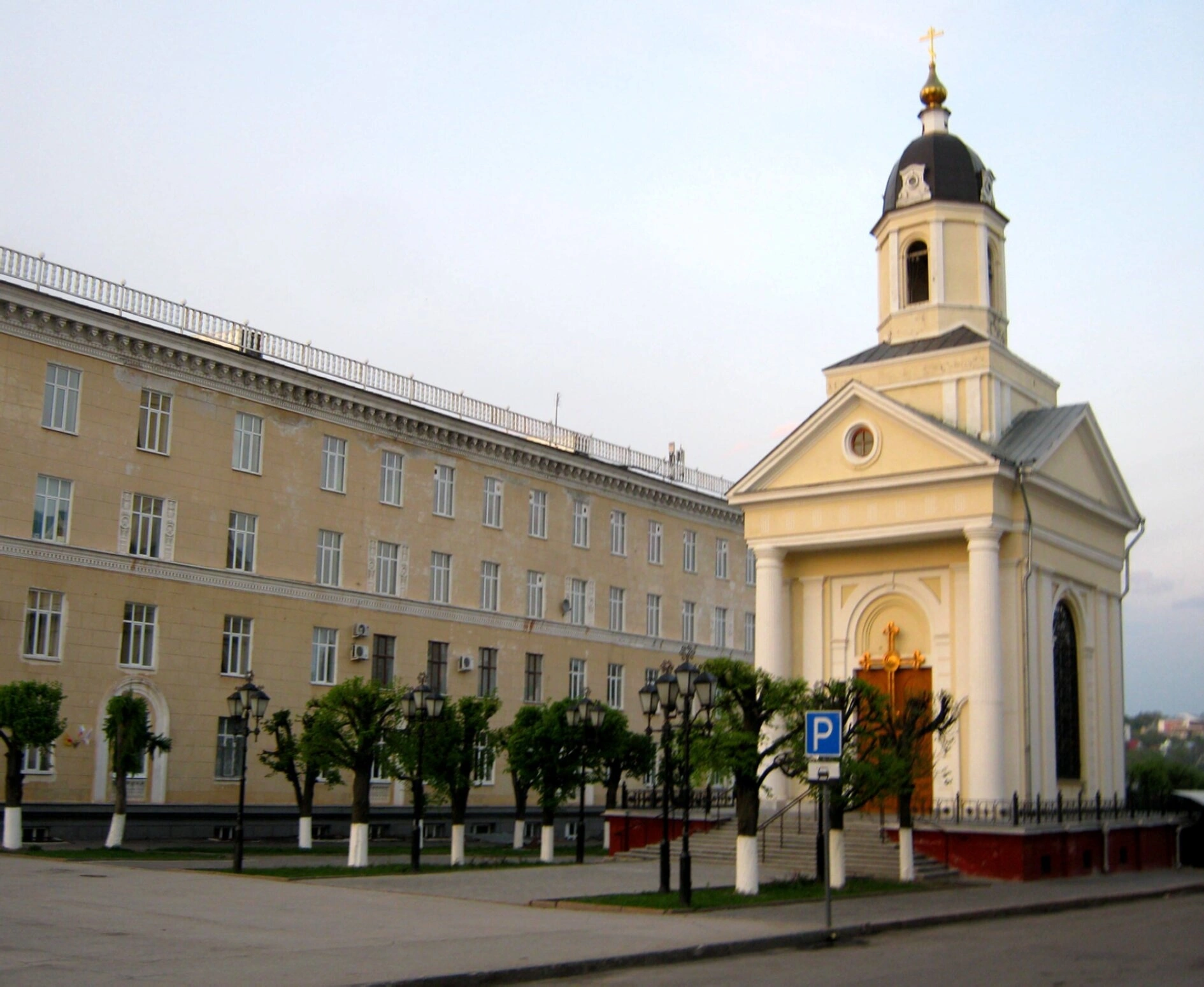 На переднем плане фотографии видны ухоженные деревья, которые обрамляют святыню, подчёркивая её благолепие и гармоничное вписывание в городской ландшафт. Рядом с церковью расположено крупное административное здание, что символизирует единство духовной и светской жизни. Прихрамовая территория благоустроена, здесь установлены уличные фонари и дорожные знаки для удобства прихожан. Храм-часовня является одной из духовных доминант города и объектом культурного наследия, привлекающим как паломников, так и ценителей православной архитектуры.