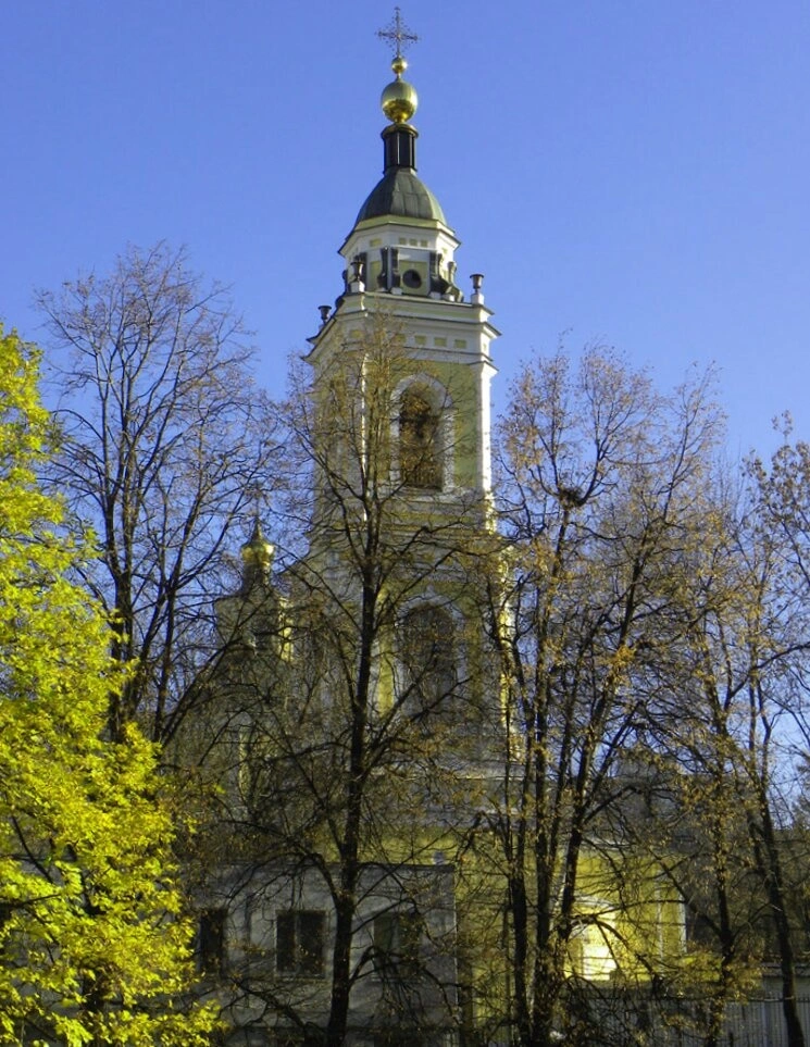 На снимке хорошо просматривается архитектурный облик храма: монументальное желтое здание с белыми декоративными элементами, увенчанное золотым куполом с воздвигнутым крестом. Колокольня, выполненная в едином стиле с основным зданием, гармонично дополняет церковный ансамбль. В оформлении фасада присутствуют характерные для барокко лепные детали и обрамления окон.