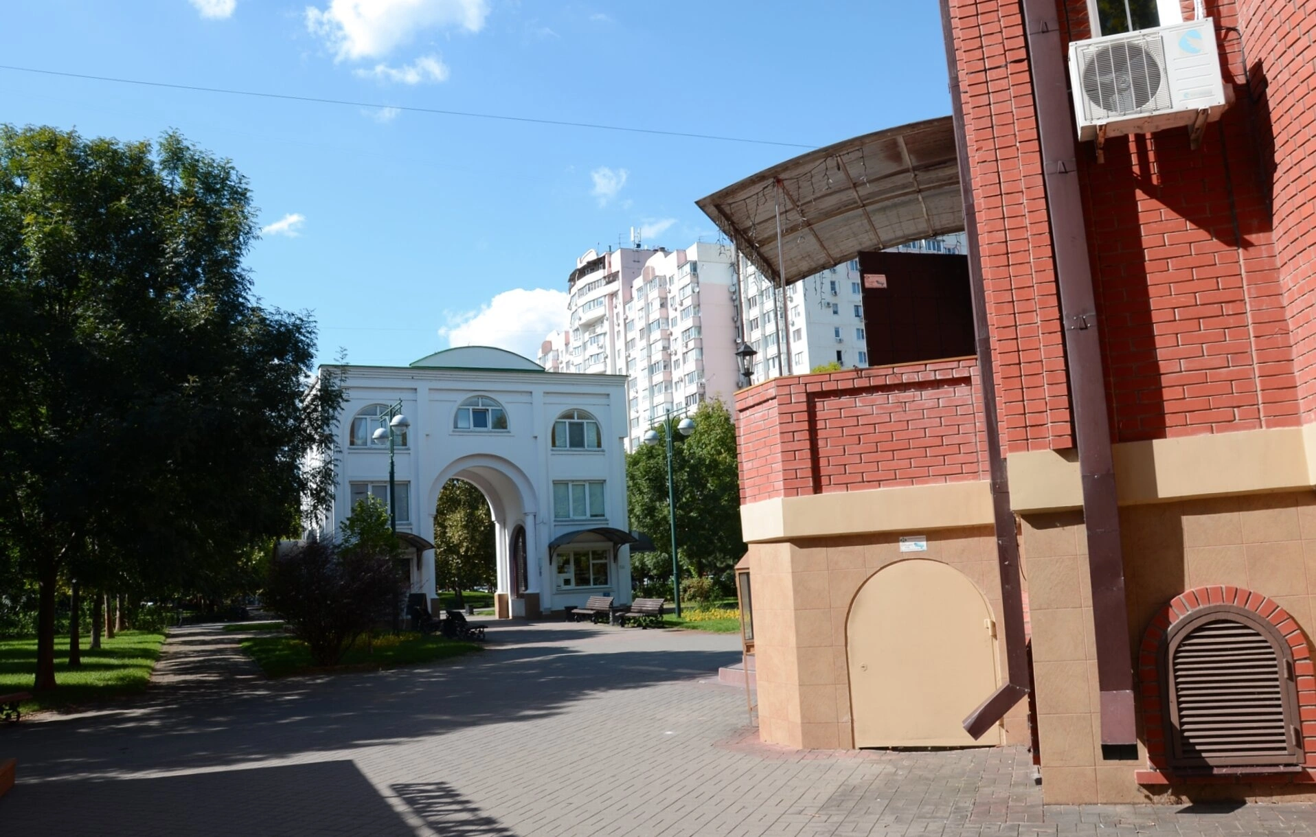 Через арочные проемы открывается вид на ухоженную аллею парка с установленными для отдыха скамейками. На переднем плане заметны элементы инфраструктуры: кирпичная кладка, водосточная система и инженерные коммуникации, органично вписанные в общий архитектурный замысел.
