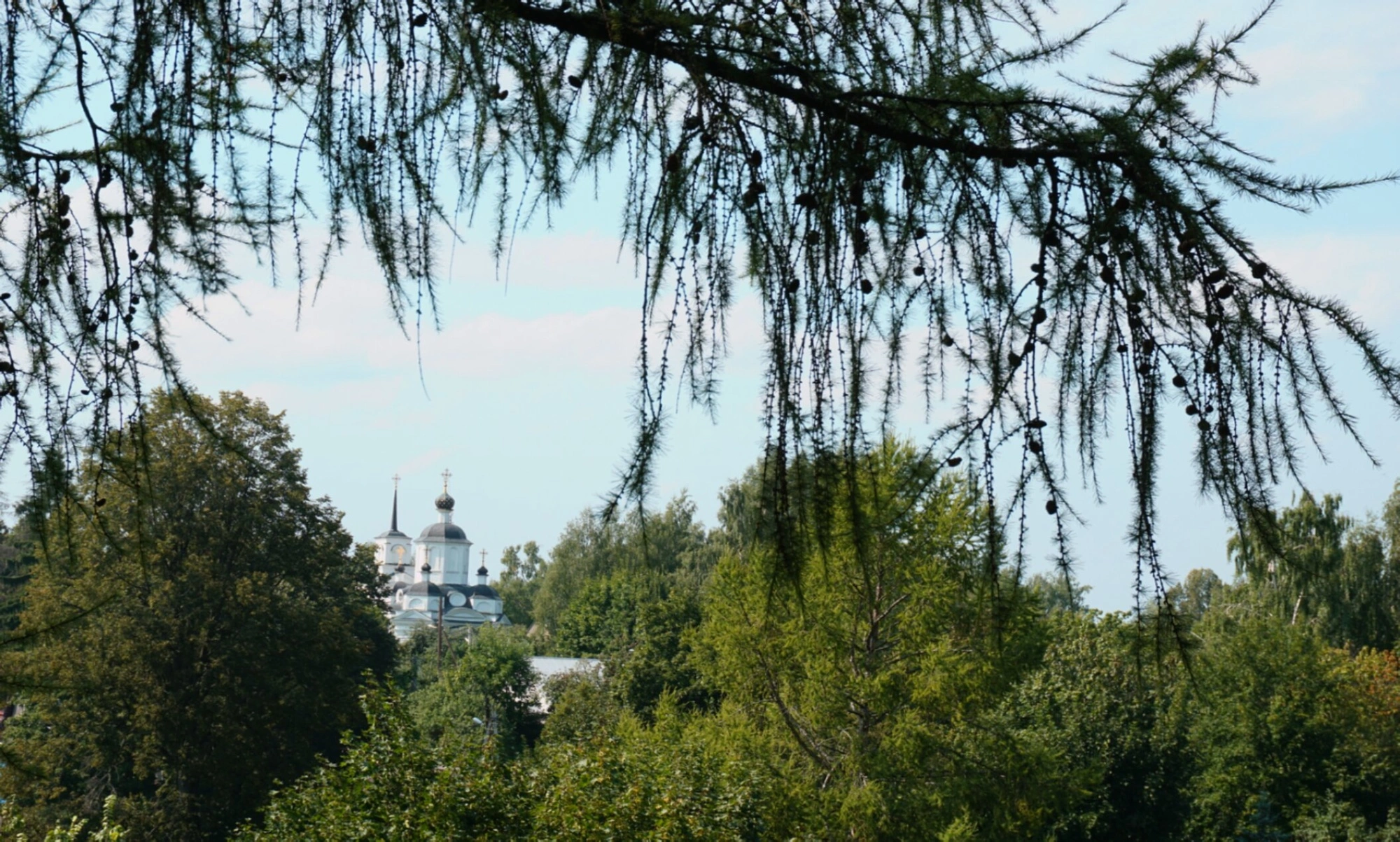 На фотографии запечатлён вид на Церковь во имя святого великомученика Димитрия Солунского в городе Рузе Московской области. Храм живописно возвышается над густой зеленью деревьев, что создаёт ощущение умиротворения и гармонии между творением рук человеческих и природной красотой. Ветвь лиственницы на переднем плане обрамляет вид на святыню, придавая кадру глубину и естественное обрамление.