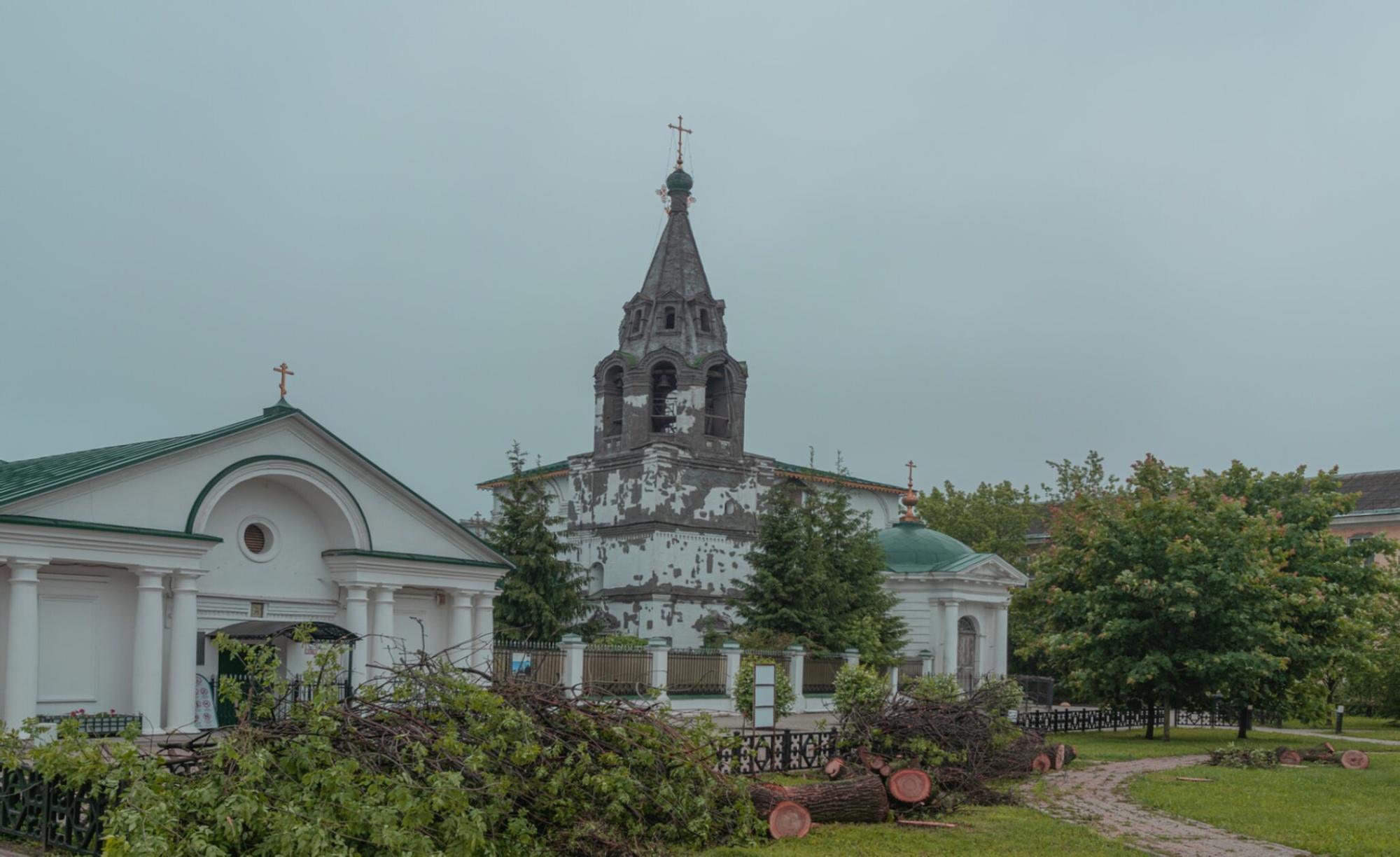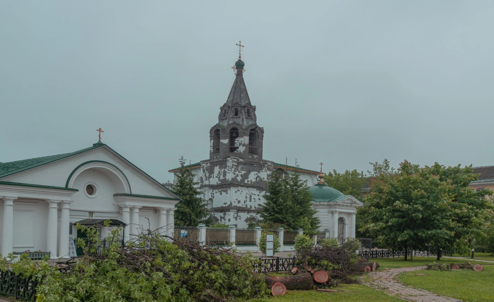 На переднем плане видны аккуратно сложенные спиленные ветви и брёвна, указывающие на проведённую работу по благоустройству и озеленению территории. Деревья и кустарники, окружающие храм, создают естественное обрамление для архитектурного ансамбля, подчёркивая его духовную и историческую значимость в городском ландшафте.