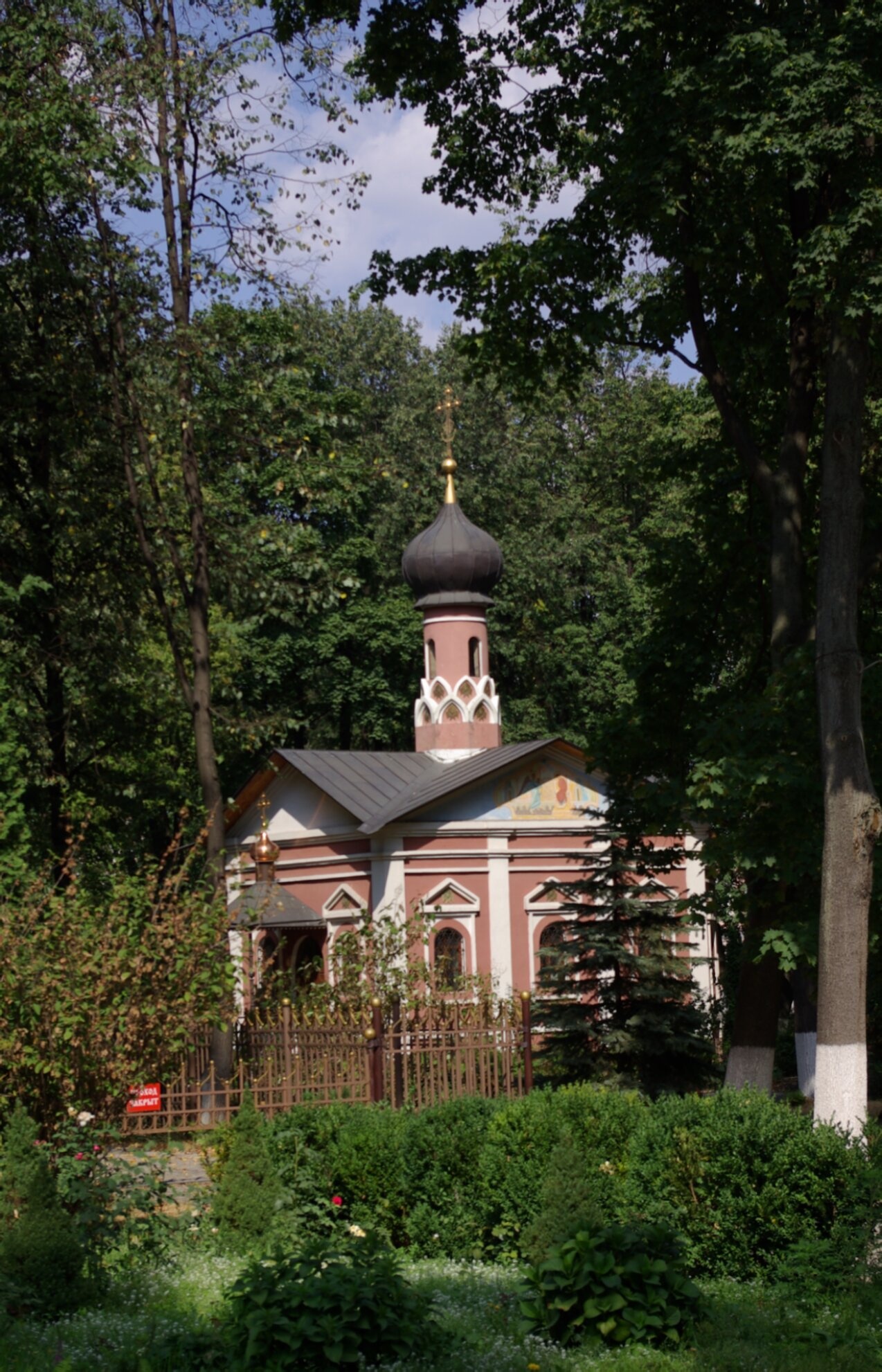 На представленной фотографии запечатлён один из храмов ставропигиального Донского мужского монастыря в Москве, древней православной обители, основанной в честь Донской иконы Божией Матери. Святыня располагается по указанным координатам и является выдающимся памятником церковного зодчества.