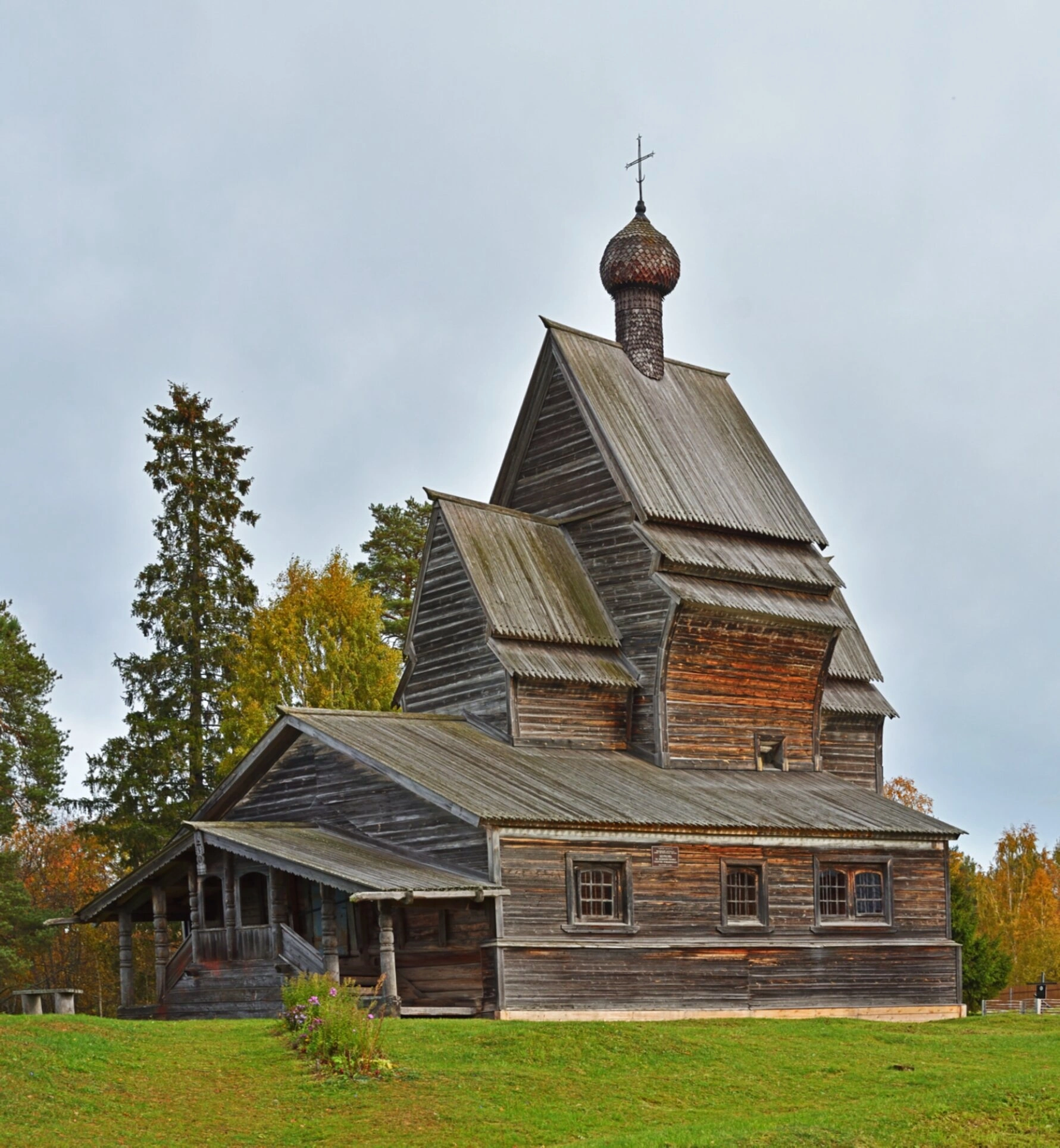 На представленной фотографии запечатлён храм во имя святого великомученика Георгия Победоносца, расположенный в древней деревне Родионово на восточном берегу Юксозера. Эта православная святыня является выдающимся памятником русского деревянного зодчества и объектом культурного наследия.