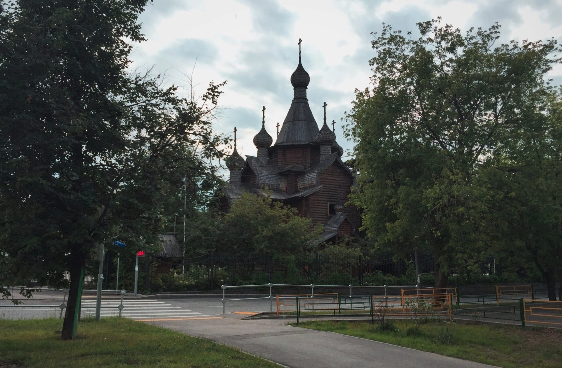 На переднем плане фотографии видна пешеходная дорожка, ведущая к храму, что символично указывает на путь верующих к Богу. Бордюр и ограждение отделяют мирскую суету от места молитвенного уединения. Пасмурная погода, запечатлённая на снимке, придаёт особое настроение созерцания и духовного сосредоточения.