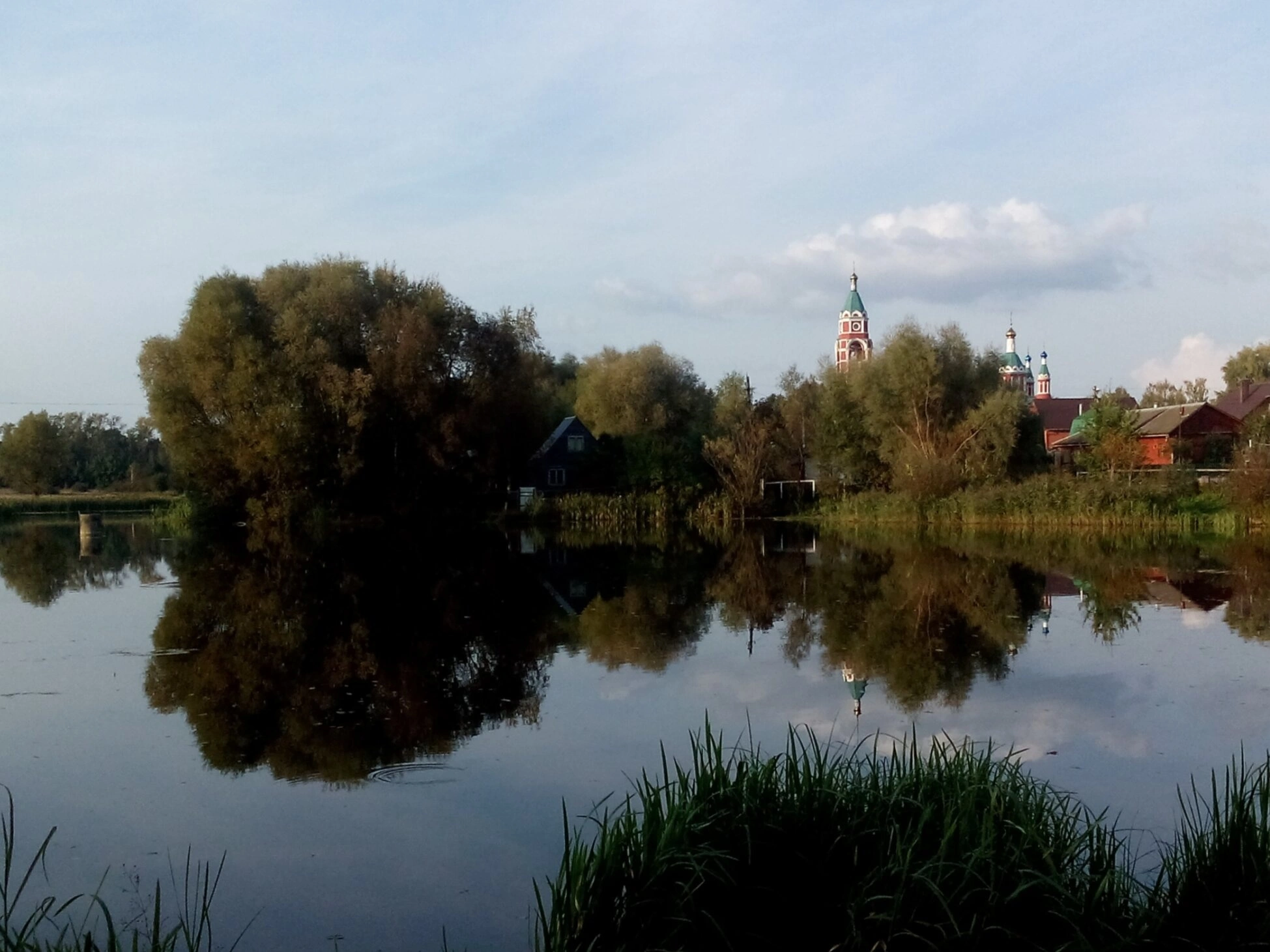 На фотографии запечатлён храм великомученика Георгия Победоносца, расположенный в селе Игнатьево Раменского городского округа Московской области. Святыня возвышается на живописном берегу водоёма, отражаясь в его спокойных водах, что создаёт особую благоговейную атмосферу этого намоленного места.